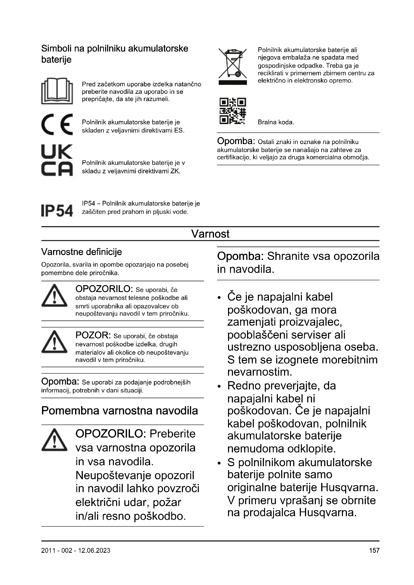 156 2011 - 002 - 12.06.2023Simboli na polnilniku akumulatorske baterije Pred začetkom uporabe izdelka natančno preberite navodila za uporabo in se prepričajte, da ste jih razumeli. Polnilnik akumulatorske baterije je skladen z veljavnimi direktivami ES. Polnilnik akumulatorske baterije je v skladu z veljavnimi direktivami ZK. IP54 – Polnilnik akumulatorske baterije je zaščiten pred prahom in pljuski vode. Polnilnik akumulatorske baterije ali njegova embalaža ne spadata med gospodinjske odpadke. Treba ga je reciklirati v primernem zbirnem centru za električno in elektronsko opremo. Bralna koda. Opomba: Ostali znaki in oznake na polnilniku akumulatorske baterije se nanašajo na zahteve za certifikacijo, ki veljajo za druga komercialna območja. Varnost Varnostne definicije Opozorila, svarila in opombe opozarjajo na posebej pomembne dele priročnika. OPOZORILO: Se uporabi, če obstaja nevarnost telesne poškodbe ali smrti uporabnika ali opazovalcev ob neupoštevanju navodil v tem priročniku. POZOR: Se uporabi, če obstaja nevarnost poškodbe izdelka, drugih materialov ali okolice ob neupoštevanju navodil v tem priročniku. Opomba: Se uporabi za podajanje podrobnejših informacij, potrebnih v dani situaciji. Pomembna varnostna navodila OPOZORILO: Preberite vsa varnostna opozorila in vsa navodila. Neupoštevanje opozoril in navodil lahko povzroči električni udar, požar in/ali resno poškodbo. Opomba: Shranite vsa opozorila in navodila.