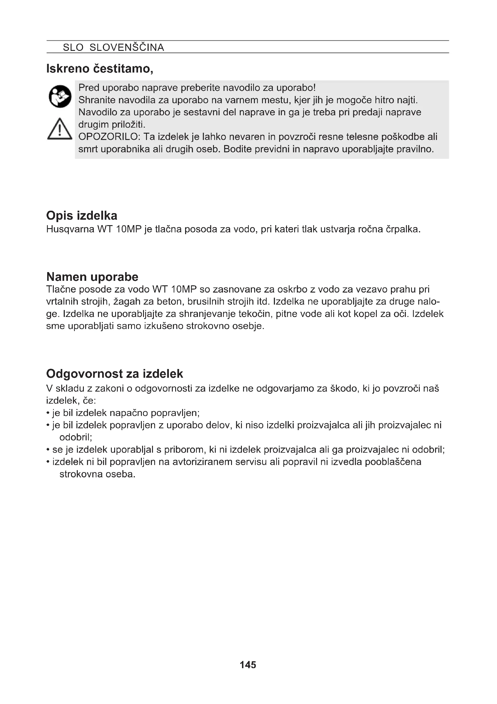 Husqvarna WT 10MP je tlačna posoda za vodo, pri kateri tlak ustvarja ročna črpalka. Opis izdelka Namen uporabe Pred uporabo naprave preberite navodilo za uporabo! Shranite navodila za uporabo na varnem mestu, kjer jih je mogoče hitro najti. Navodilo za uporabo je sestavni del naprave in ga je treba pri predaji naprave drugim priložiti. OPOZORILO: Ta izdelek je lahko nevaren in povzroči resne telesne poškodbe ali smrt uporabnika ali drugih oseb. Bodite previdni in napravo uporabljajte pravilno. Tlačne posode za vodo WT 10MP so zasnovane za oskrbo z vodo za vezavo prahu pri vrtalnih strojih, žagah za beton, brusilnih strojih itd. Izdelka ne uporabljajte za druge nalo- ge. Izdelka ne uporabljajte za shranjevanje tekočin, pitne vode ali kot kopel za oči. Izdelek sme uporabljati samo izkušeno strokovno osebje. Odgovornost za izdelek V skladu z zakoni o odgovornosti za izdelke ne odgovarjamo za škodo, ki jo povzroči naš izdelek, če: