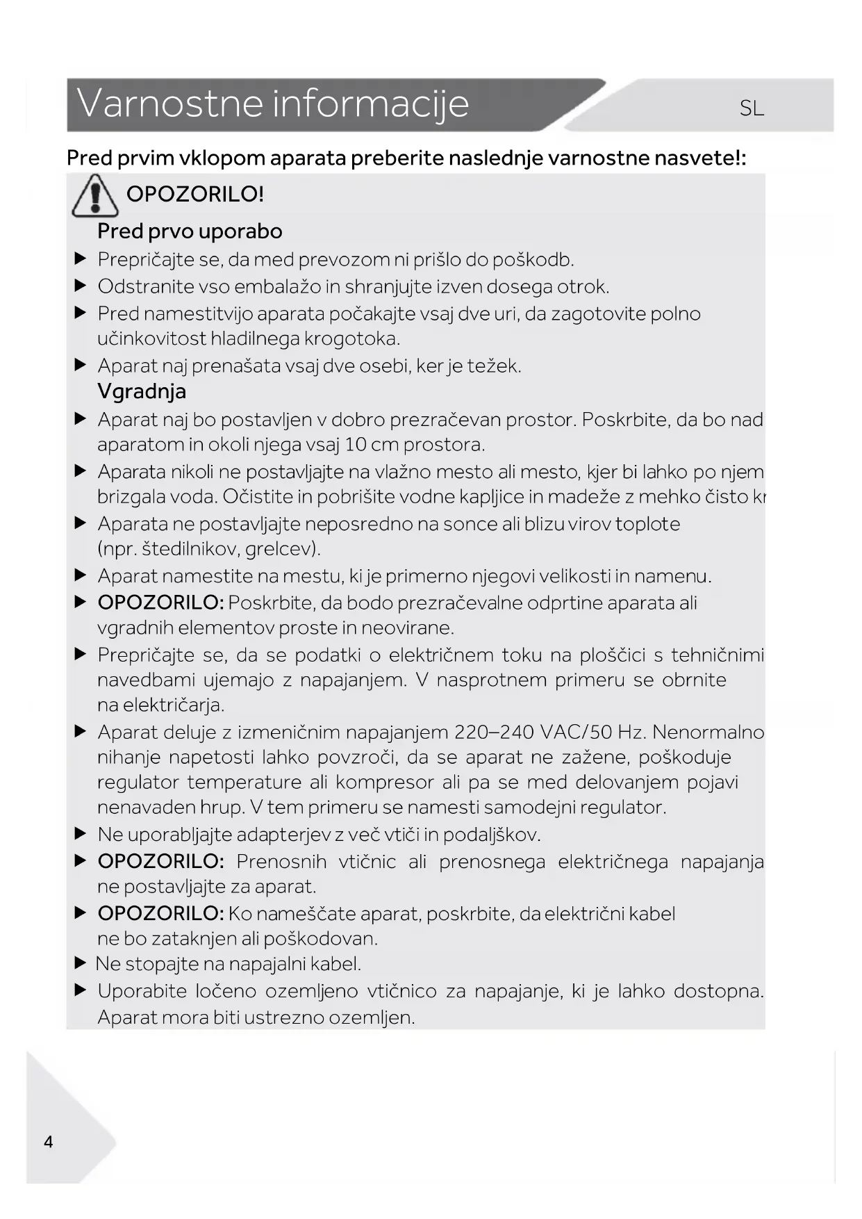 OPOZORILO! Pred prvo uporabo Prepričajte se, da med prevozom ni prišlo do poškodb. Odstranite vso embalažo in shranjujte izven dosega otrok. Pred namestitvijo aparata počakajte vsaj dve uri, da zagotovite polno učinkovitost hladilnega krogotoka. Aparat naj prenašata vsaj dve osebi, ker je težek. Vgradnja Aparat naj bo postavljen v dobro prezračevan prostor. Poskrbite, da bo nad aparatom in okoli njega vsaj 10 cm prostora. Aparata nikoli ne postavljajte na vlažno mesto ali mesto, kjer bi lahko po njem brizgala voda. Očistite in pobrišite vodne kapljice in madeže z mehko čisto krpo. Aparata ne postavljajte neposredno na sonce ali blizu virov toplote (npr. štedilnikov, grelcev). Aparat namestite na mestu, ki je primerno njegovi velikosti in namenu. OPOZORILO: Poskrbite, da bodo prezračevalne odprtine aparata ali vgradnih elementov proste in neovirane. Prepričajte se, da se podatki o električnem toku na ploščici s tehničnimi navedbami ujemajo z napajanjem. V nasprotnem primeru se obrnite na električarja. Aparat deluje z izmeničnim napajanjem 220–240 VAC/50 Hz. Nenormalno nihanje napetosti lahko povzroči, da se aparat ne zažene, poškoduje regulator temperature ali kompresor ali pa se med delovanjem pojavi nenavaden hrup. V tem primeru se namesti samodejni regulator. Ne uporabljajte adapterjev z več vtiči in podaljškov. OPOZORILO: Prenosnih vtičnic ali prenosnega električnega napajanja ne postavljajte za aparat. OPOZORILO: Ko nameščate aparat, poskrbite, da električni kabel ne bo zataknjen ali poškodovan. Ne stopajte na napajalni kabel. Uporabite ločeno ozemljeno vtičnico za napajanje, ki je lahko dostopna. Aparat mora biti ustrezno ozemljen.5 Varnostne informacije