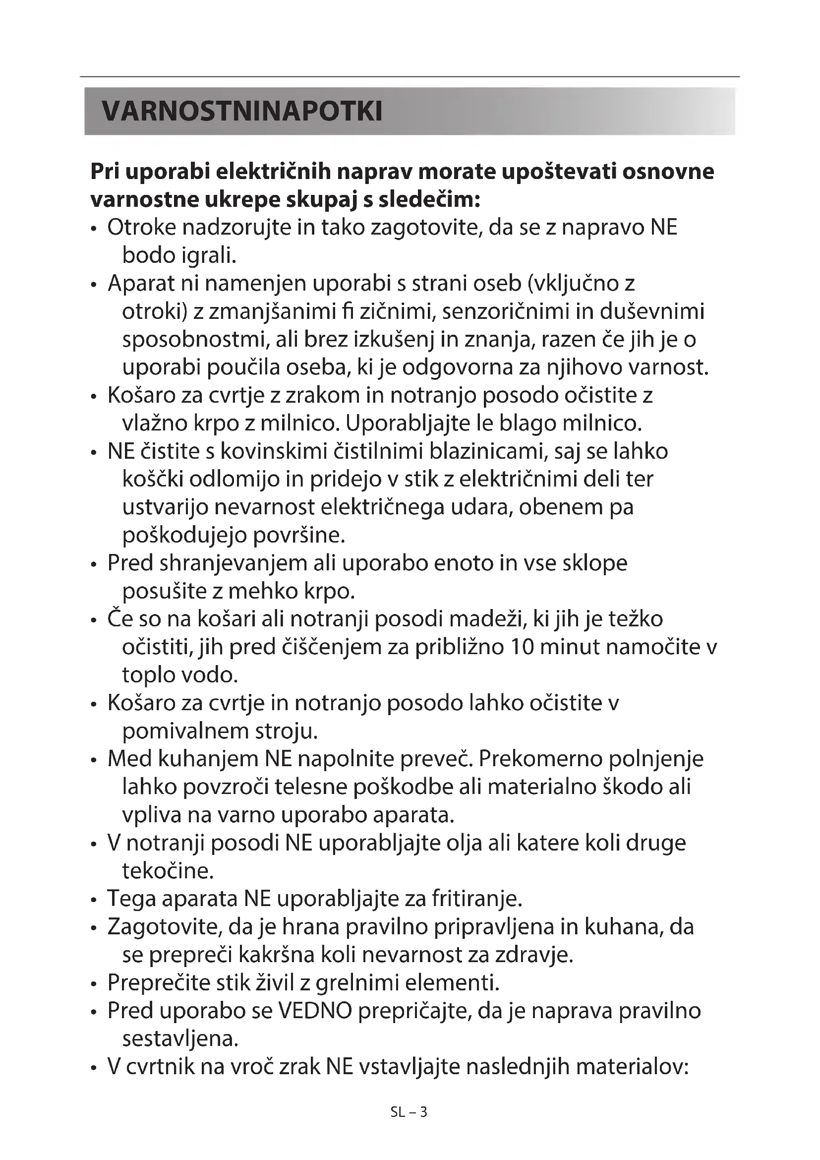 - V cvrtnik na vroč zrak NE vstavljajte naslednjih materialov:SL SL – 3SL – 3 VARNOSTNI NAPOTKI Pri uporabi električnih naprav morate upoštevati osnovne varnostne ukrepe skupaj s sledečim: