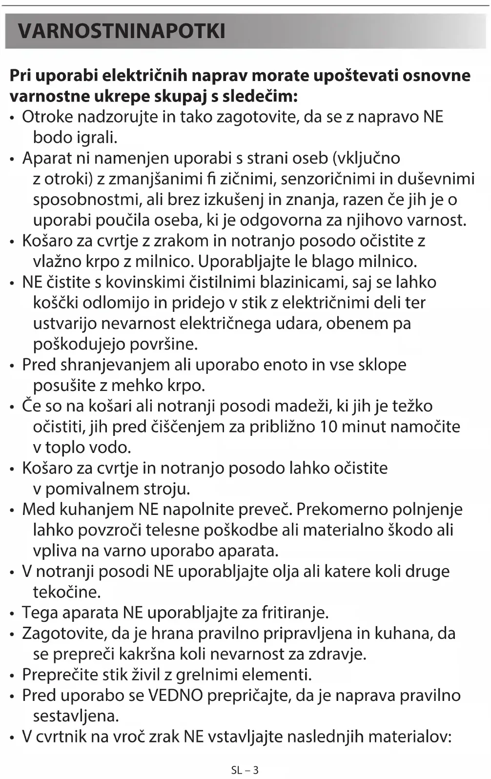 - V cvrtnik na vroč zrak NE vstavljajte naslednjih materialov:SL SL – 3SL – 3 VARNOSTNI NAPOTKI Pri uporabi električnih naprav morate upoštevati osnovne varnostne ukrepe skupaj s sledečim: