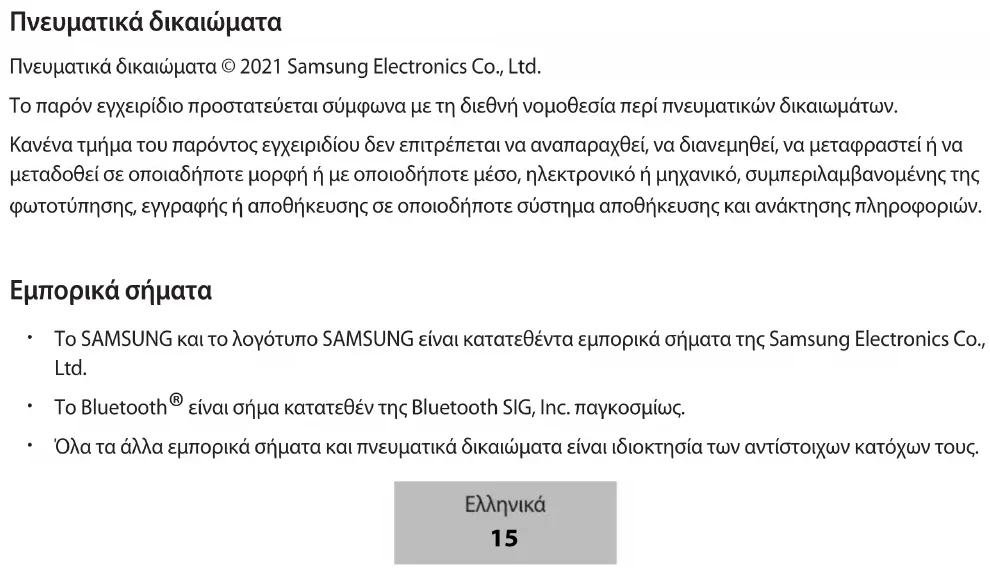 Družba Samsung ne prevzema odgovornosti za kakršne koli poškodbe ali izgubo (bodisi po pogodbi ali nepogodbeno, vključno z malomarnostjo), do katerih lahko pride zaradi nenatančnega upoštevanja teh opozoril in navodil, z izjemo smrti ali osebnih poškodb, do katerih pride zaradi malomarnosti družbe Samsung. Slovenščina 14Avtorske pravice Avtorske pravice © 2021 Samsung Electronics Co., Ltd. Ta priročnik je zaščiten z mednarodnimi zakoni o avtorskih pravicah. Noben del tega priročnika se ne sme reproducirati, distribuirati, prevesti ali prenašati v kakršnikoli obliki ali na kakršenkoli način, v elektronski ali mehanski obliki, vključno s fotokopiranjem, snemanjem ali shranjevanjem v kakršnemkoli sistemu za shranjevanje in pridobivanje podatkov. Blagovne znamke