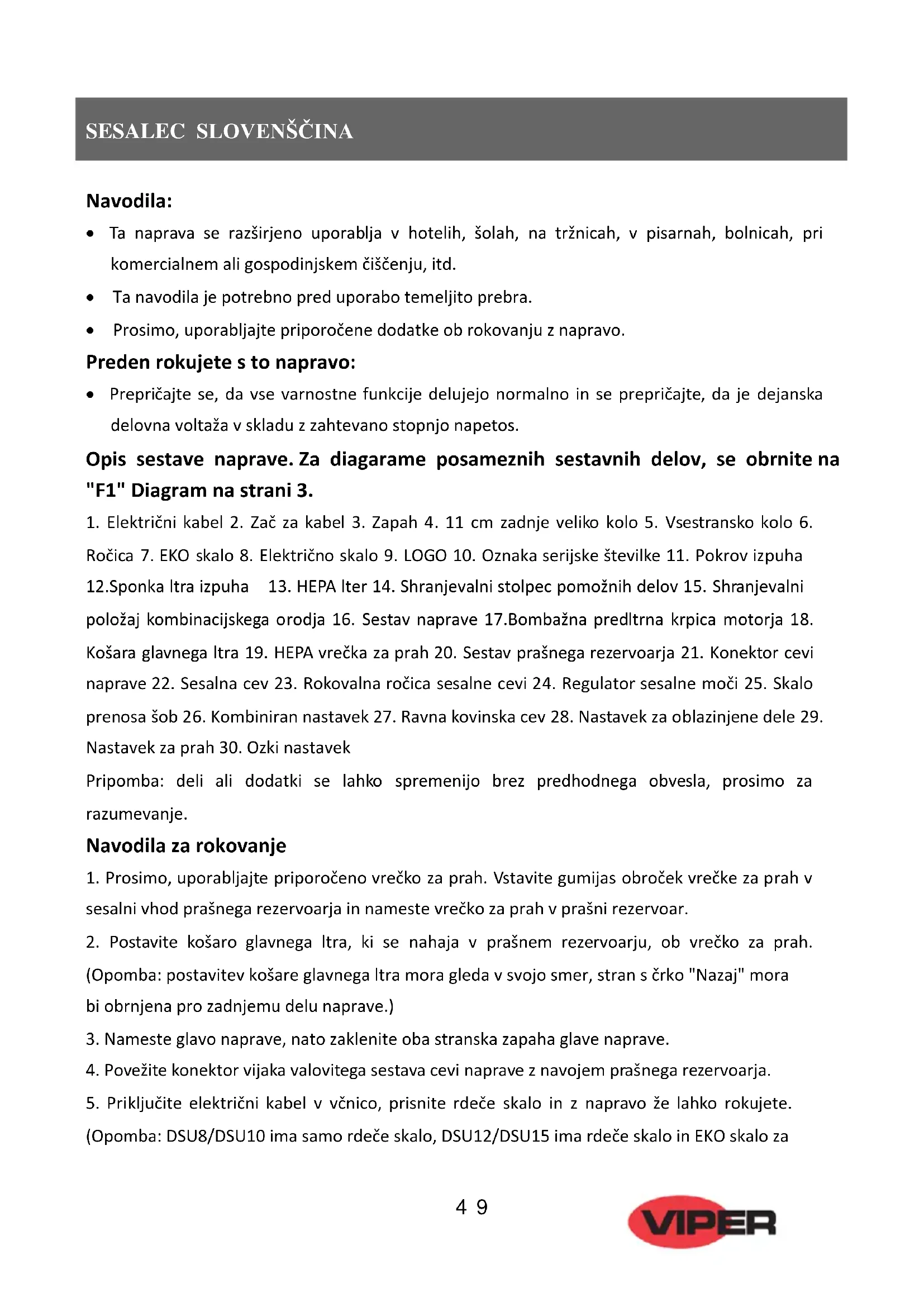 Ročica 7. EKO stikalo 8. Električno stikalo 9. LOGO 10. Oznaka serijske številke 11. Pokrov izpuha 12.Sponka filtra izpuha 13. HEPA filter 14. Shranjevalni stolpec pomožnih delov 15. Shranjevalni položaj kombinacijskega orodja 16. Sestav naprave 17.Bombažna predfiltrna krpica motorja 18. Košara glavnega filtra 19. HEPA vrečka za prah 20. Sestav prašnega rezervoarja 21. Konektor cevi naprave 22. Sesalna cev 23. Rokovalna ročica sesalne cevi 24. Regulator sesalne moči 25. Stikalo prenosa šob 26. Kombiniran nastavek 27. Ravna kovinska cev 28. Nastavek za oblazinjene dele 29. Nastavek za prah 30. Ozki nastavek Pripomba: deli ali dodatki se lahko spremenijo brez predhodnega obvestila, prosimo za razumevanje. Navodila za rokovanje