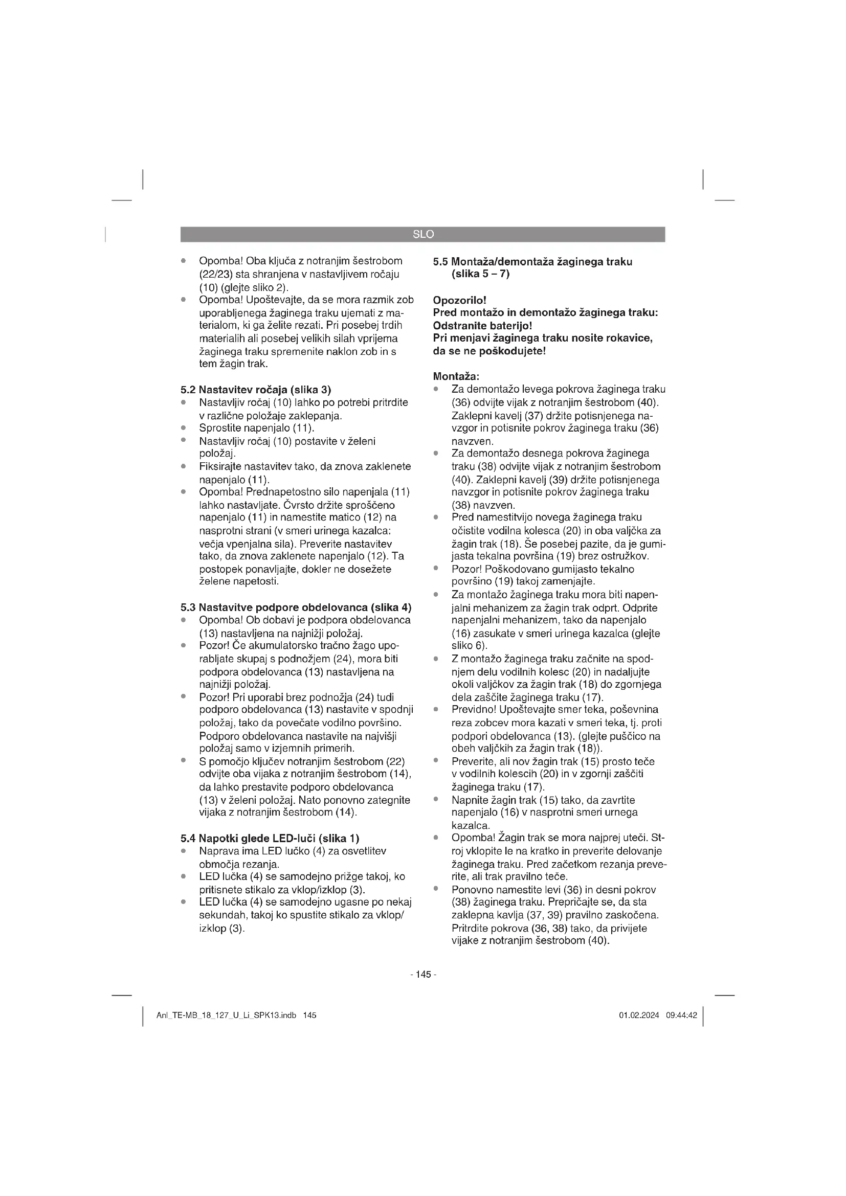 Samo za dežele EU Električnega orodja ne mečite med gospodinjske odpadke! V skladu z evropsko smernico 2012/19/EG o starih električnih in elektronskih napravah in v skladu z iz- vajanjem nacionalne zakonodaje morate ločeno zbirati izrabljena električna orodja in jih predati v okoljs- ko varno ponovno predelavo. Reciklažna alternativa za poziv za vračanje: Lastnik električne naprave je alternativno zavezan, da namesto vračanja sodeluje pri pri strokovno ustreznem recikliranju v primeru predaje lastnine. Staro napravo se lahko v ta namen tudi prepusti na odvzemnem mestu, ki izvaja odstranjevanje v smislu nacionalne zakonodaje o odstranjevanju takšnih odpadkov. To se ne nanaša na starim napravam priložene dele pribora in opreme brez električnih kom- ponent. Pred odstranjevanjem, iz naprave odstranite akumulator in svetilo (npr. žarnico). Ponatis ali kakršnokoli razmnoževanje dokumentacije in spremljajočih papirjev o proizvodu, tudi po izvlečkih, je dovoljeno samo z izrecnim soglasjem Einhell Germany AG. Pridržana pravica do tehničnih sprememb. Anl_TE-MB_18_127_U_Li_SPK13.indb 151Anl_TE-MB_18_127_U_Li_SPK13.indb 151 01.02.2024 09:44:4301.02.2024 09:44:43SLO