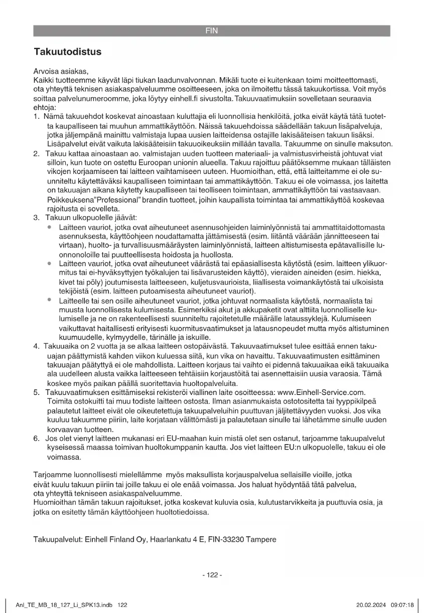jamstvo prenese na lokalnega servisnega partnerja. Garancijskega zahtevka ni mogoče uveljavljati, če je bilo blago odposlano izven EU. Proti povračilu stroškov vam nudimo popravilo okvarjenih naprav, za katere je garancijsko obdobje že poteklo. V ta namen napravo odpošljite na naš servisni naslov. Pri obrabi, potrošnih in manjkajočih delih se sklicujemo na omejitve tega jamstva v skladu z informacijami o servisu, navedenih v teh navodilih za uporabo. Porok/ Storitev:Einhell Croatia d.o.o., Pustodol Začretski 19/H, 49223 Sv. Križ Začretje, Hrvatska Anl_TE_MB_18_127_Li_SPK13.indb 132Anl_TE_MB_18_127_Li_SPK13.indb 132 20.02.2024 09:07:2120.02.2024 09:07:21H