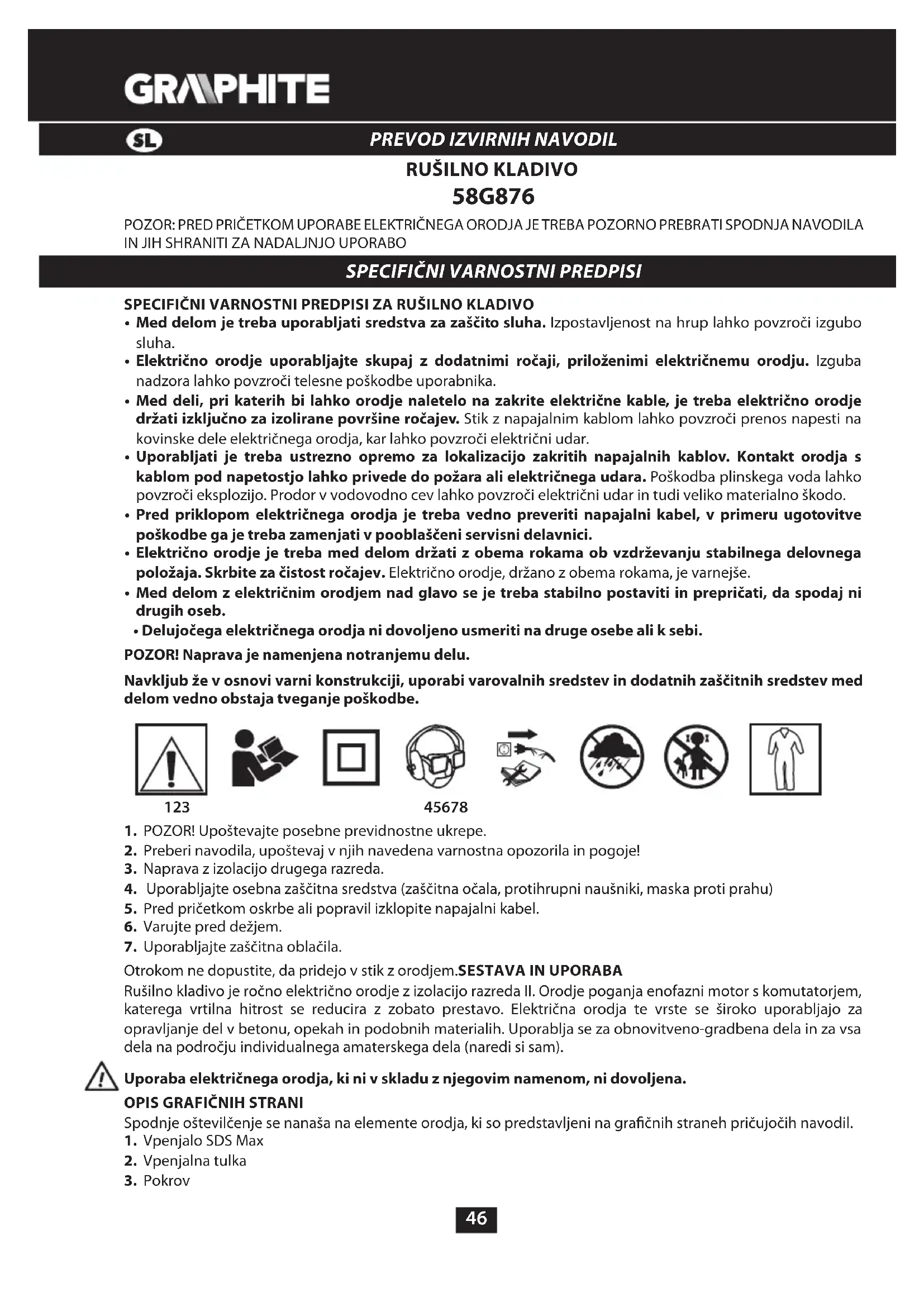 Otrokom ne dopustite, da pridejo v stik z orodjem.SESTAVA IN UPORABA Rušilno kladivo je ročno električno orodje z izolacijo razreda II. Orodje poganja enofazni motor s komutatorjem, katerega vrtilna hitrost se reducira z zobato prestavo. Električna orodja te vrste se široko uporabljajo za opravljanje del v betonu, opekah in podobnih materialih. Uporablja se za obnovitveno-gradbena dela in za vsa dela na področju individualnega amaterskega dela (naredi si sam). Uporaba električnega orodja, ki ni v skladu z njegovim namenom, ni dovoljena.