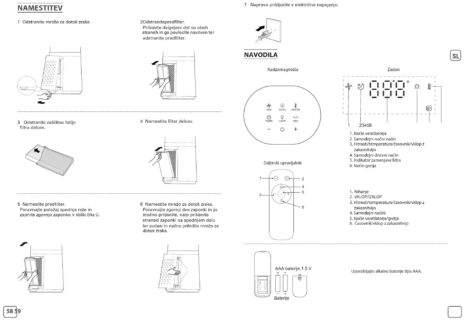 Gumbov Opis funkcij gumbov VKLOP/IZKLOP Samodejni izklop: Naprava se bo samodejno izklopila po 12 urah, če je ne uporabljate. Ročno nastavite hitrost ventilatorja, ciljno temperaturo gretja, časovnik in vklop z zakasnitvijo. Preklop za nihanje pod kotom 30°,60°, 90° in 0°. Pritisnite, da aktivirate funkcijo ventilatorja. Izdelek bo privzeto deloval v samodej- nem načinu. Pritisnite + ali –, da preklopite v ročni način. Pritisnite, da aktivirate funkcijo gretja. Izdelek bo privzeto deloval v samodejnem načinu. Pritisnite + ali –, da preklopite v ročni način. Najvišja temperatura delovanja je 35°C. Pritisnite enkrat, da aktivirate samodejni dnevni način: