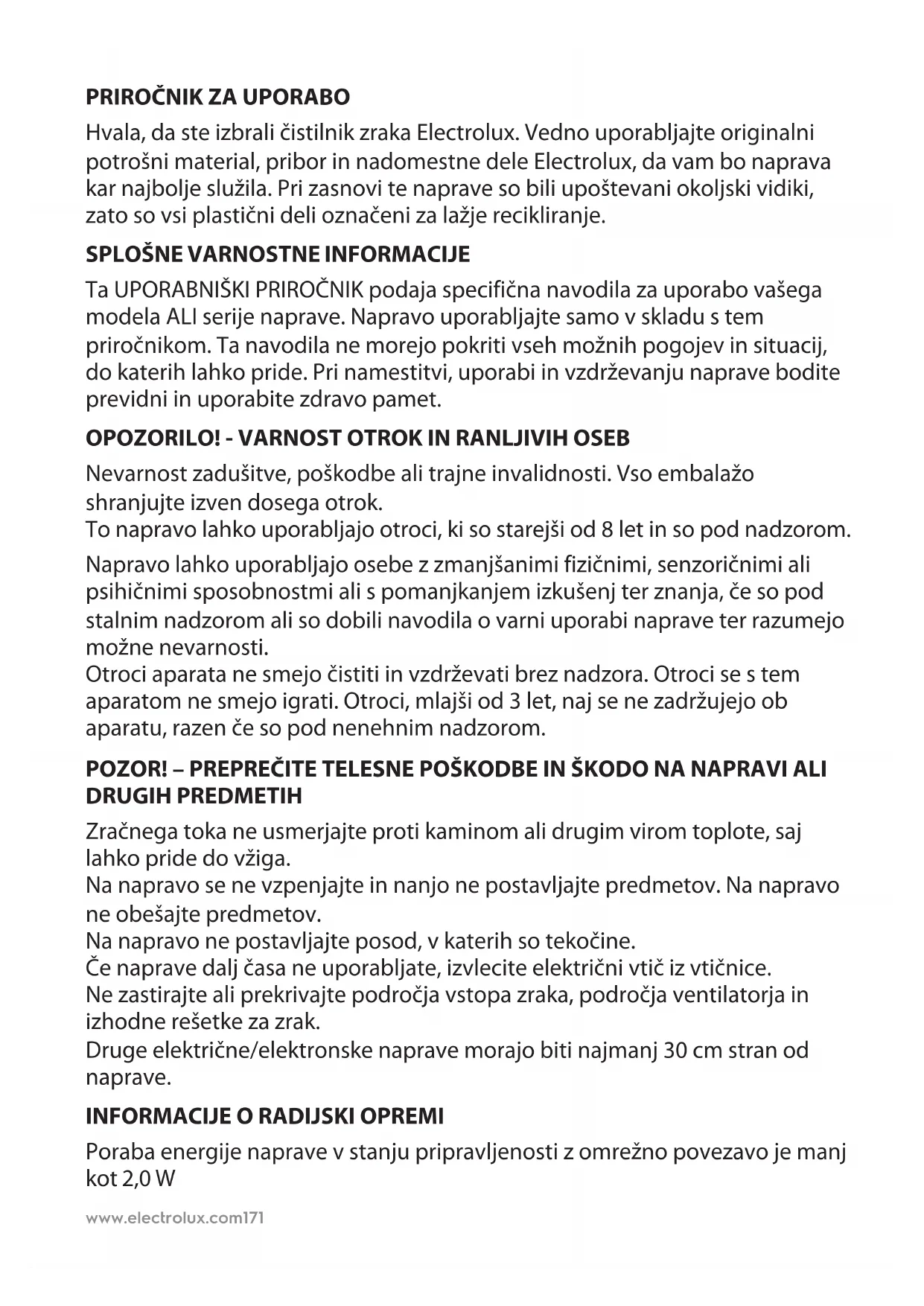 OPOMBA: Vaš model naprave morda nima vseh komponent in funkcij, opisanih v tem UPORABNIŠKEM PRIROČNIKU. Glede natančnih podrobnosti o vašem modelu glejte ovojnino naprave ALI spletno stran s tehničnimi podatki naprave na našem spletnem mestu. Electrolux si pridržuje pravico do spreminjanja tehničnih podatkov brez predhodnega obvestila.www.electrolux.com174