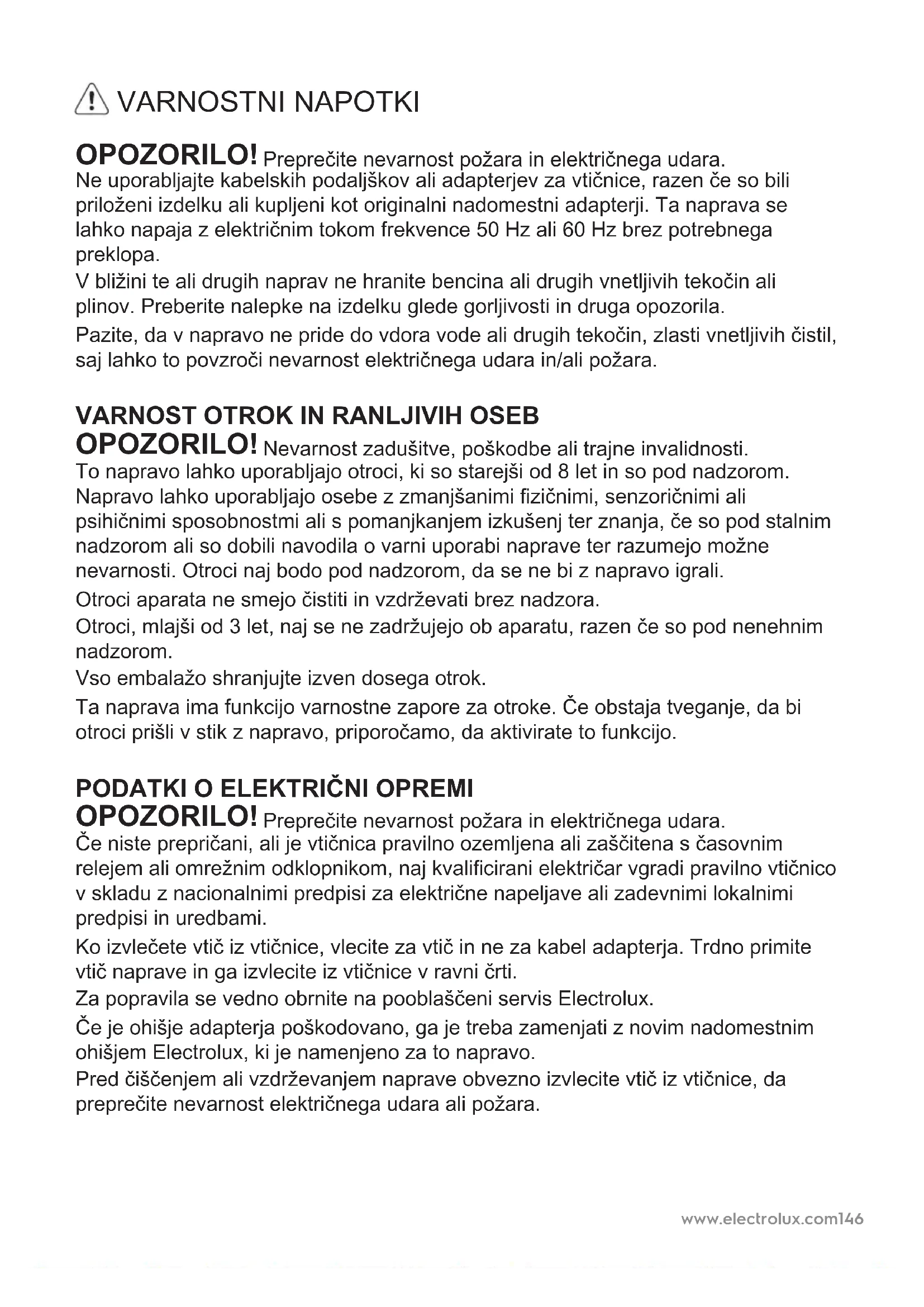 OPOZORILO! Nevarnost zadušitve, poškodbe ali trajne invalidnosti. To napravo lahko uporabljajo otroci, ki so starejši od 8 let in so pod nadzorom. Napravo lahko uporabljajo osebe z zmanjšanimi zičnimi, senzoričnimi ali psihičnimi sposobnostmi ali s pomanjkanjem izkušenj ter znanja, če so pod stalnim nadzorom ali so dobili navodila o varni uporabi naprave ter razumejo možne nevarnosti. Otroci naj bodo pod nadzorom, da se ne bi z napravo igrali. Otroci aparata ne smejo čistiti in vzdrževati brez nadzora. Otroci, mlajši od 3 let, naj se ne zadržujejo ob aparatu, razen če so pod nenehnim nadzorom. Vso embalažo shranjujte izven dosega otrok. Ta naprava ima funkcijo varnostne zapore za otroke. Če obstaja tveganje, da bi otroci prišli v stik z napravo, priporočamo, da aktivirate to funkcijo.