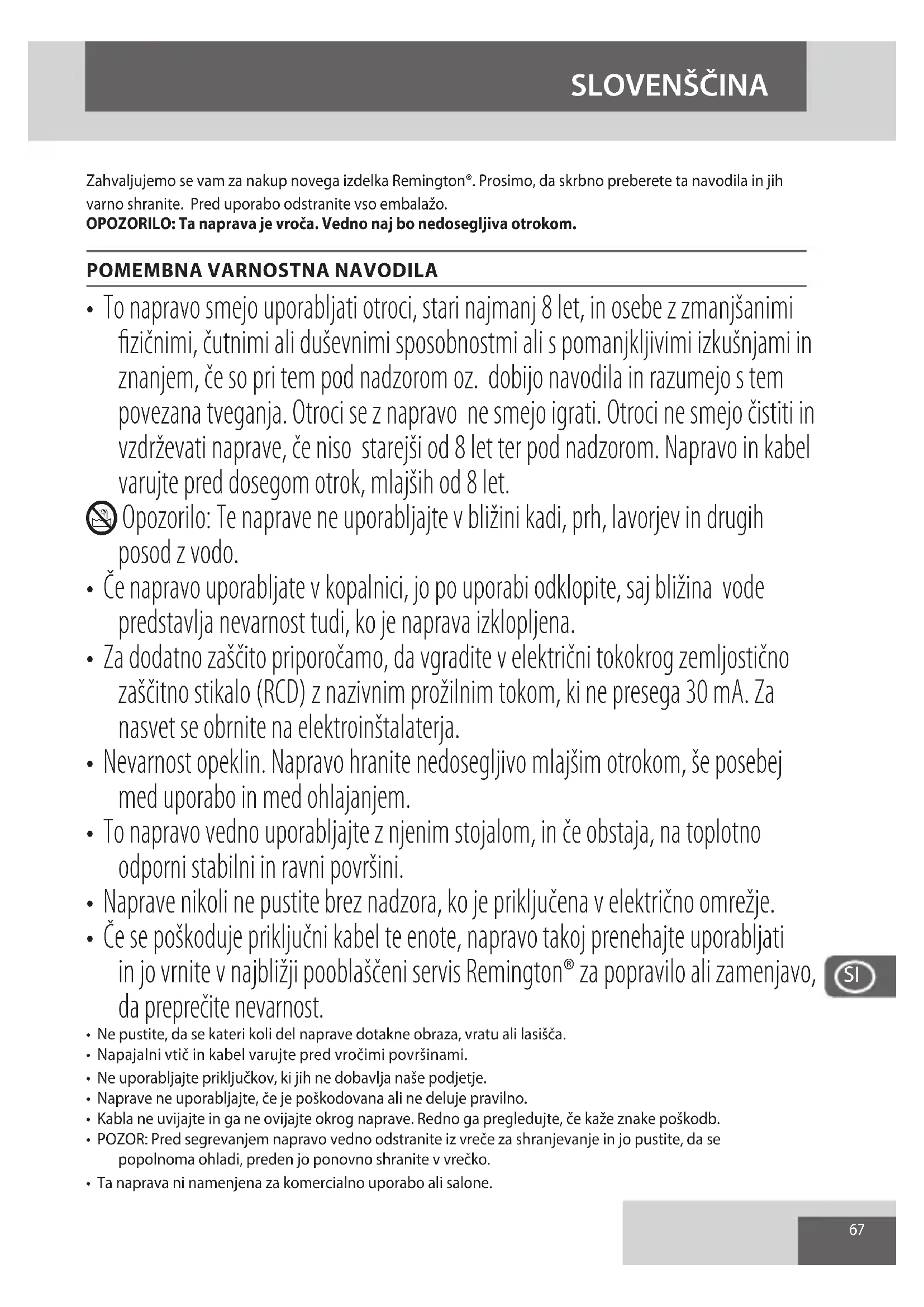 - Če se poškoduje priključni kabel te enote, napravo takoj prenehajte uporabljati in jo vrnite v najbližji pooblaščeni servis Remington® za popravilo ali zamenjavo, da preprečite nevarnost.