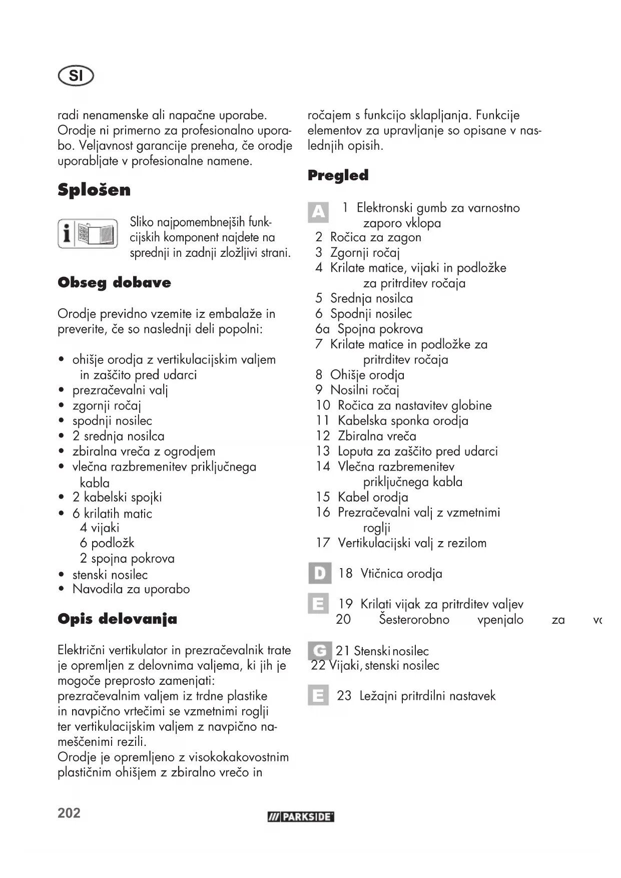 - Navodila za uporabo Opis delovanja Električni vertikulator in prezračevalnik trate je opremljen z delovnima valjema, ki jih je mogoče preprosto zamenjati: prezračevalnim valjem iz trdne plastike in navpično vrtečimi se vzmetnimi roglji ter vertikulacijskim valjem z navpično na- meščenimi rezili. Orodje je opremljeno z visokokakovostnim plastičnim ohišjem z zbiralno vrečo in ročajem s funkcijo sklapljanja. Funkcije elementov za upravljanje so opisane v nas- lednjih opisih. Pregled