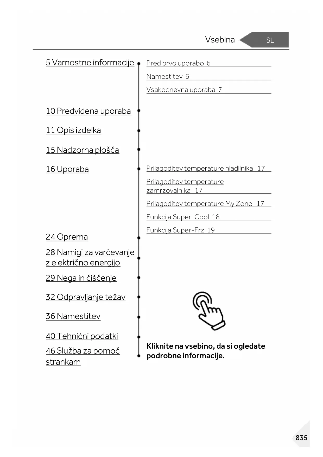 Pred prvo uporabo 6 Namestitev 6 Vsakodnevna uporaba 7 5 Varnostne informacije 10 Predvidena uporaba 11 Opis izdelka 15 Nadzorna plošča 16 Uporaba 24 Oprema 28 Namigi za varčevanje z električno energijo 29 Nega in čiščenje 32 Odpravljanje težav 36 Namestitev 40 Tehnični podatki 46 Služba za pomoč strankam Prilagoditev temperature hladilnika 17 Prilagoditev temperature zamrzovalnika 17 Prilagoditev temperature My Zone 17 Funkcija Super-Cool 18 Funkcija Super-Frz 19 Kliknite na vsebino, da si ogledate podrobne informacije. 835Hvala