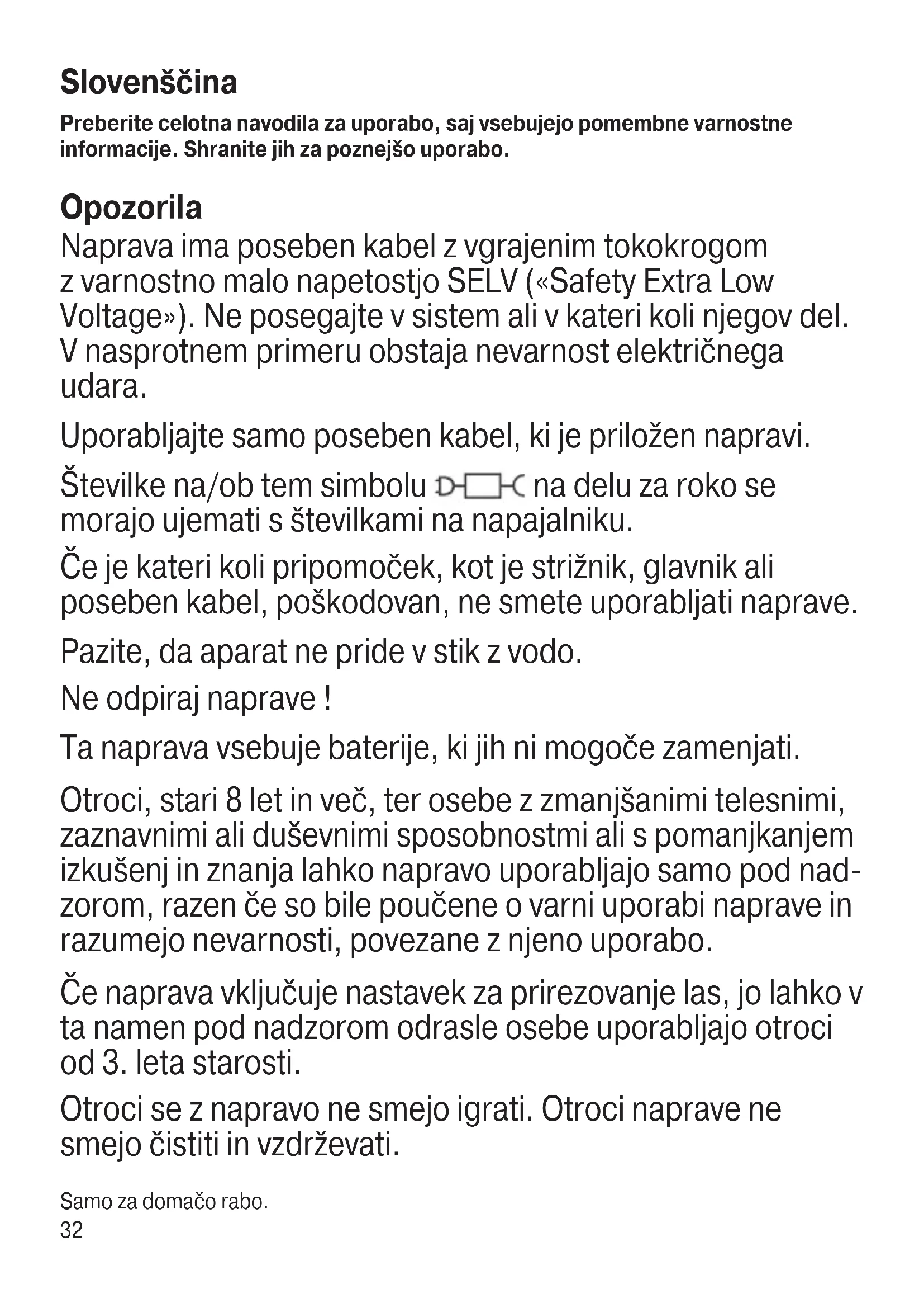 UL. 4. Gardijske brigade 43, Tel. 095 66 26 556 (u sklopu poslovnog prostora ROBOT COMMERCE d.o.o. (TTTS)), split@singuli.hr, ili nazovite Call centar singuli: 072 700 707 90340910_Type5516_BT3421_3420_3411_3410_3400x_CEEMEA.indd 3190340910_Type5516_BT3421_3420_3411_3410_3400x_CEEMEA.indd 31 20.07.22 10:0320.07.22 10:0332 Slovenščina Preberite celotna navodila za uporabo, saj vsebujejo pomembne varnostne informacije. Shranite jih za poznejšo uporabo. Opozorila Naprava ima poseben kabel z vgrajenim tokokrogom z varnostno malo napetostjo SELV («Safety Extra Low Voltage»). Ne posegajte v sistem ali v kateri koli njegov del. V nasprotnem primeru obstaja nevarnost električnega udara. Uporabljajte samo poseben kabel, ki je priložen napravi. Številke na/ob tem simbolu na delu za roko se morajo ujemati s številkami na napajalniku. Če je kateri koli pripomoček, kot je strižnik, glavnik ali poseben kabel, poškodovan, ne smete uporabljati naprave. Pazite, da aparat ne pride v stik z vodo. Ne odpiraj naprave ! Ta naprava vsebuje baterije, ki jih ni mogoče zamenjati. Otroci, stari 8 let in več, ter osebe z zmanjšanimi telesnimi, zaznavnimi ali duševnimi sposobnostmi ali s pomanjkanjem izkušenj in znanja lahko napravo uporabljajo samo pod nad- zorom, razen če so bile poučene o varni uporabi naprave in razumejo nevarnosti, povezane z njeno uporabo. Če naprava vključuje nastavek za prirezovanje las, jo lahko v ta namen pod nadzorom odrasle osebe uporabljajo otroci od 3. leta starosti. Otroci se z napravo ne smejo igrati. Otroci naprave ne smejo čistiti in vzdrževati. Samo za domačo rabo. 90340910_Type5516_BT3421_3420_3411_3410_3400x_CEEMEA.indd 3290340910_Type5516_BT3421_3420_3411_3410_3400x_CEEMEA.indd 32 20.07.22 10:0320.07.22 10:0333 Pozor Med polnjenjem mora biti naprava izklopljena. Pomembno Priporočena temperatura prostora, v katerem poteka polnjenje, naj bo med 5 °C in 35 °C. Pri višjih ali nižjih temperaturah se baterija morda ne bo ustrezno napolnila. Priporočena temperatura okolice za striženje znaša med 15 °C in 35 °C. Naprave ne izpostavljajte temperaturam nad 50 °C za daljši čas. Če želite, da bodo nastavki pravilno delovali, prirezovalnik in folije redno naoljite s kapljico lahkega strojnega olja (ni vključeno). Opis 1a Glava prirezovalnika*/** 1b Glava natančnega prirezovalnika*/** 1c Glava brivnika z mini folijo* 2 Izbirnik dolžine 3 Stikalo za vklop/izklop 4 Napajalni vhod 5 Napajalnik** 6 Indikator napolnjenosti baterije 7 Glavnik za natančno prirezovanje brade (0,5–10 mm)*/** 8 Glavnik za natančno prirezovanje las (10,5–20 mm)*/**