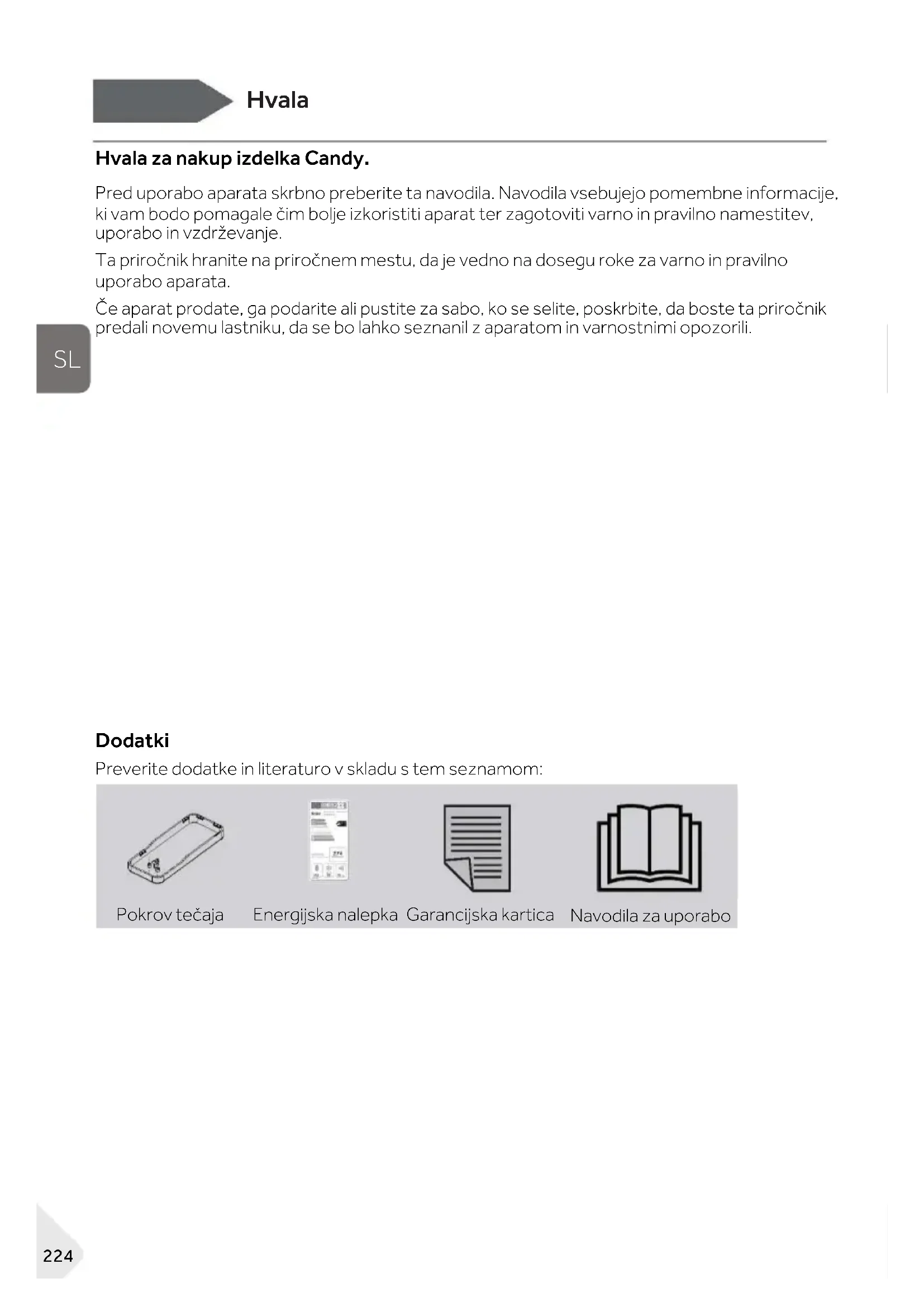 Hvala za nakup izdelka Candy. Pred uporabo aparata skrbno preberite ta navodila. Navodila vsebujejo pomembne informacije, ki vam bodo pomagale čim bolje izkoristiti aparat ter zagotoviti varno in pravilno namestitev, uporabo in vzdrževanje. Ta priročnik hranite na priročnem mestu, da je vedno na dosegu roke za varno in pravilno uporabo aparata. Če aparat prodate, ga podarite ali pustite za sabo, ko se selite, poskrbite, da boste ta priročnik predali novemu lastniku, da se bo lahko seznanil z aparatom in varnostnimi opozorili. Dodatki Preverite dodatke in literaturo v skladu s tem seznamom:
