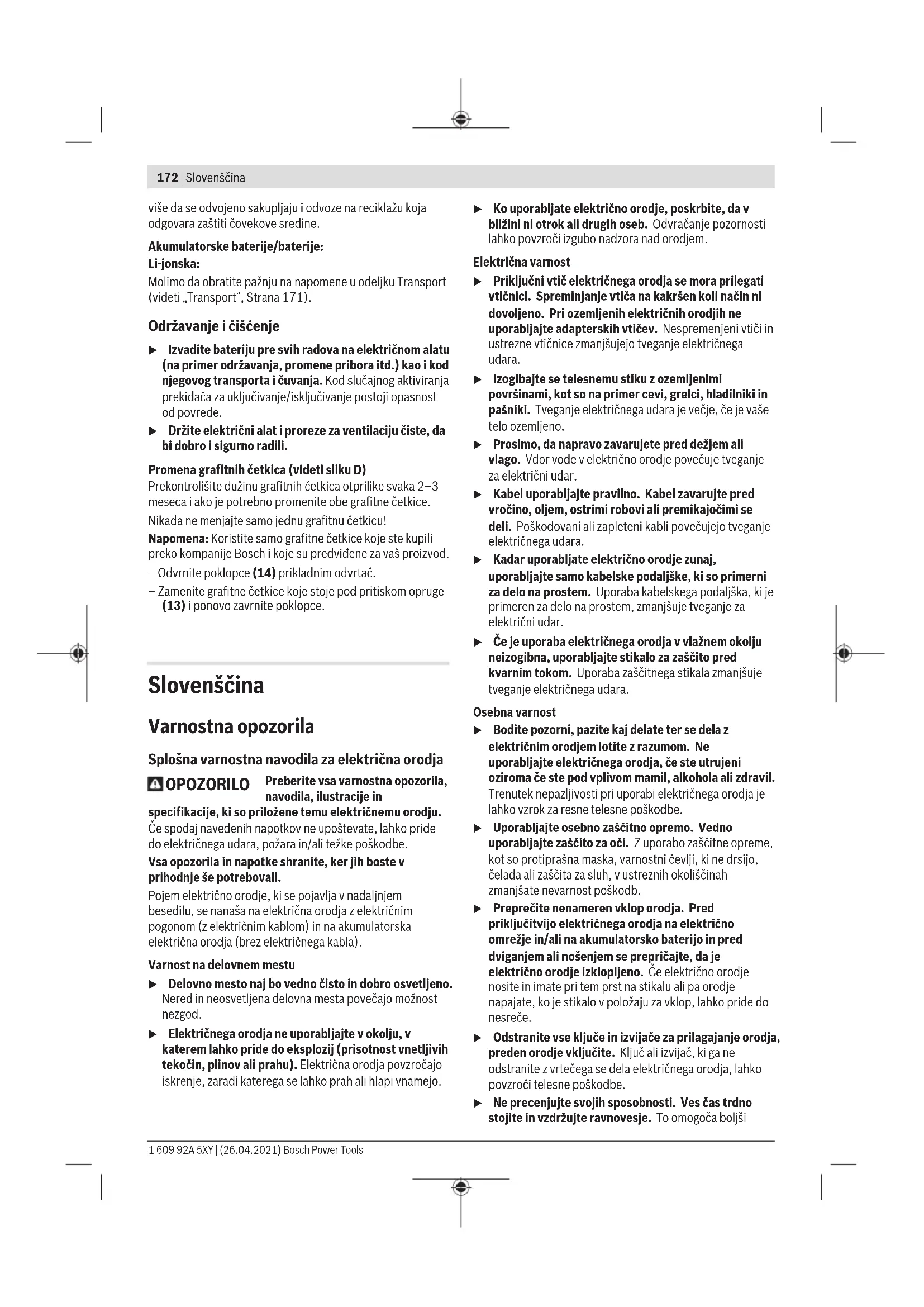 M10 13 17.5 22 23 26 29 35 39 47 65 78 M12 22.6 30 37.6 40 45 50 60 67 80 113 135 M14 36 48 60 65 72 79 95 107 130 180 215 M16 55 73 92 98 110 122 147 165 196 275 330 Saveti Pre uvrtanja većih, dužih zavrtanja u tvrde radne komade trebalo bi najpre probušiti presekom jezgra navoja na oko 2/3 dužine zavrtnja. Napomena: Pazite na to, da nijedan mali metalni deo ne prodre u električni alat. Stezaljka za držanje pojasa Pomoću stezaljke za držanje pojasa možete zakačiti električni alat npr. za pojas. Imate onda obe ruke slobodne i električni alat vam je uvek na dohvat ruke. Uputstva za optimalno ophodjenje sa akumulatorom Zaštitite akumulator od vlade i vode. Lagerujte akumulator samo u području temperature od −20°C do 50°C. Ne ostavljajte akumulator leti npr. u autu. Čistite povremeno proreze za ventilaciju akumulatora sa mekom, čistom i suvom četkicom. Bitno skraćeno vreme rada posle punjenja pokazuje da je akumulator istrošen i da se mora zameniti. Obratite pažnju na uputstva za uklanjanje otpada. Održavanje i servis Održavanje i čišćenje u Izvadite bateriju pre svih radova na električnom alatu (na primer održavanja, promene pribora itd.) kao i kod njegovog transporta i čuvanja. Kod slučajnog aktiviranja prekidača za uključivanje/isključivanje postoji opasnost od povrede. u Držite električni alat i proreze za ventilaciju čiste, da bi dobro i sigurno radili. Promena grafitnih četkica (videtislikuD) Prekontrolišite dužinu grafitnih četkica otprilike svaka 2–3 meseca i ako je potrebno promenite obe grafitne četkice. Nikada ne menjajte samo jednu grafitnu četkicu! Napomena: Koristite samo grafitne četkice koje ste kupili preko kompanije Bosch i koje su predviđene za vaš proizvod. – Odvrnite poklopce (14) prikladnim odvrtač. – Zamenite grafitne četkice koje stoje pod pritiskom opruge (13) i ponovo zavrnite poklopce. Servis i saveti za upotrebu Servis odgovara na vaša pitanja u vezi sa popravkom i održavanjem vašeg proizvoda kao i u vezi sa rezervnim delovima. Šematske prikaze i informacije u vezi rezervnih delova naći ćete i pod: www.bosch-pt.com Bosch tim za konsultacije vam rado pomaže tokom primene, ukoliko imate pitanja o našim proizvodima i njihovom priboru. Molimo da kod svih pitanja i naručivanja rezervnih delova neizostavno navedete broj artikla sa 10brojčanih mesta prema tipskoj pločici proizvoda. Srpski Bosch Elektroservis Dimitrija Tucovića 59 11000 Beograd Tel.: +381 11 644 8546 Tel.: +381 11 744 3122 Tel.: +381 11 641 6291 Fax: +381 11 641 6293 E-Mail: office@servis-bosch.rs www.bosch-pt.rs Dodatne adrese servisa pogledajte na: www.bosch-pt.com/serviceaddresses Transport Akumulatorske baterije koje sadrže litijum jon podležu zahtevima prava o opasnim materijama. Akumulatorske baterije korisnik može transportovati na drumu bez drugih pakovanja. Kod slanja preko trećih lica (na primer vazdušnih transportom ili špedicijom) mora se obratiti pažnja na posebne zahteve u pogledu pakovanja i označavanja. Tada se kod pripreme paketa za slanje mora pozvati stručnjak za opasne materije. Akumulatorske baterije šaljite samo ako kućište nije oštećeno. Odlepite otvorene kontakte i upakujte akumulatorsku bateriju tako, da se ne pokreće u paketu. Molimo da obratite pažnju na eventualne dalje nationalne propise. Uklanjanje đubreta Električne alate, akumulacione baterije, pribor i pakovanja treba predati na reciklažu koja je u skladu sa zaštitom životne sredine. Ne bacajte električne alate i akumulatore/ baterije u kućno djubre! Samo za EU‑zemlje: Prema evropskoj smernici 2012/19/EU električni alati koji su neupotrebljivi, a prema evropskoj smernici 2006/66/EC ni akumulatori/baterije koji su u kvaru ili istrošeni, ne moraju Bosch Power Tools 1 609 92A 5XY | (26.04.2021)172 | Slovenščina više da se odvojeno sakupljaju i odvoze na reciklažu koja odgovara zaštiti čovekove sredine. Akumulatorske baterije/baterije: Li-jonska: Molimo da obratite pažnju na napomene u odeljku Transport (videti „Transport“, Strana171). Održavanje i čišćenje u Izvadite bateriju pre svih radova na električnom alatu (na primer održavanja, promene pribora itd.) kao i kod njegovog transporta i čuvanja. Kod slučajnog aktiviranja prekidača za uključivanje/isključivanje postoji opasnost od povrede. u Držite električni alat i proreze za ventilaciju čiste, da bi dobro i sigurno radili. Promena grafitnih četkica (videtislikuD) Prekontrolišite dužinu grafitnih četkica otprilike svaka 2–3 meseca i ako je potrebno promenite obe grafitne četkice. Nikada ne menjajte samo jednu grafitnu četkicu! Napomena: Koristite samo grafitne četkice koje ste kupili preko kompanije Bosch i koje su predviđene za vaš proizvod. – Odvrnite poklopce (14) prikladnim odvrtač. – Zamenite grafitne četkice koje stoje pod pritiskom opruge (13) i ponovo zavrnite poklopce. Slovenščina Varnostna opozorila Splošna varnostna navodila za električna orodja OPOZORILO Preberite vsa varnostna opozorila, navodila, ilustracije in specifikacije, ki so priložene temu električnemu orodju. Če spodaj navedenih napotkov ne upoštevate, lahko pride do električnega udara, požara in/ali težke poškodbe. Vsa opozorila in napotke shranite, ker jih boste v prihodnje še potrebovali. Pojem električno orodje, ki se pojavlja v nadaljnjem besedilu, se nanaša na električna orodja z električnim pogonom (z električnim kablom) in na akumulatorska električna orodja (brez električnega kabla). Varnost na delovnem mestu u Delovno mesto naj bo vedno čisto in dobro osvetljeno. Nered in neosvetljena delovna mesta povečajo možnost nezgod. u Električnega orodja ne uporabljajte v okolju, v katerem lahko pride do eksplozij (prisotnost vnetljivih tekočin, plinov ali prahu). Električna orodja povzročajo iskrenje, zaradi katerega se lahko prah ali hlapi vnamejo. u Ko uporabljate električno orodje, poskrbite, da v bližini ni otrok ali drugih oseb. Odvra