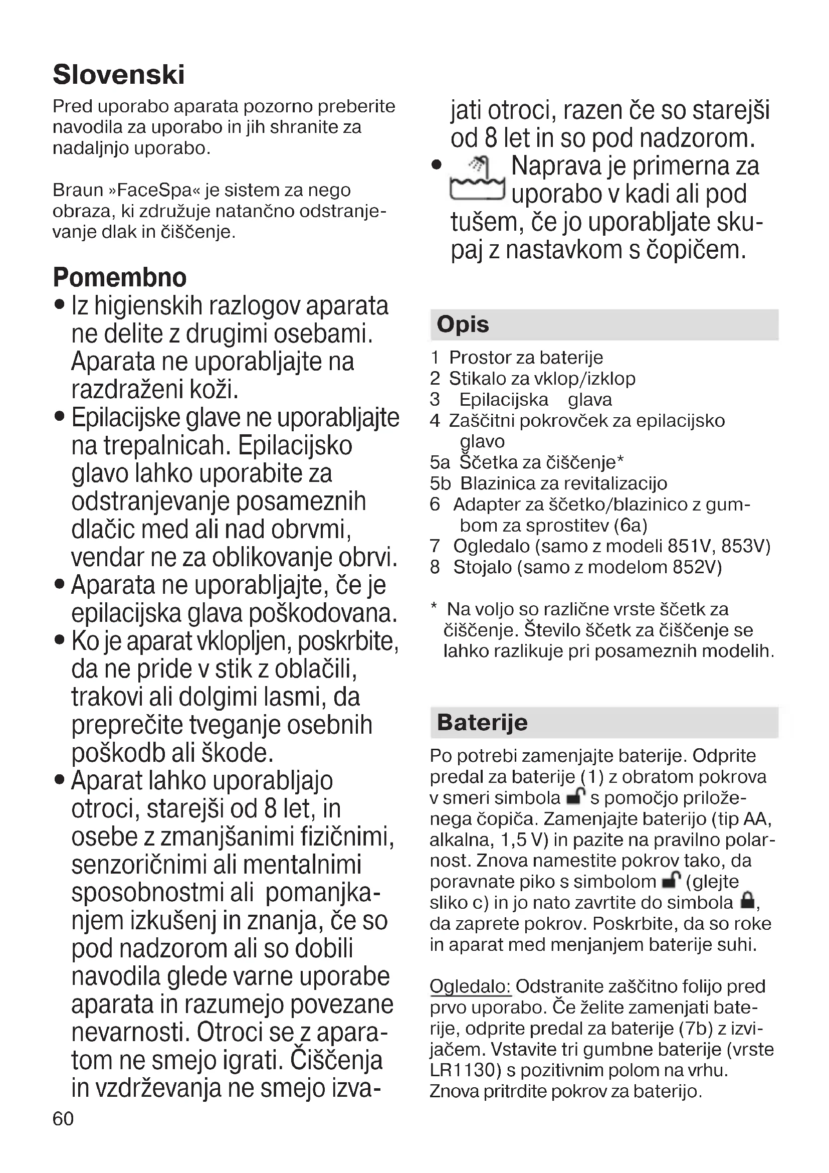 Naprava je primerna za uporabo v kadi ali pod tušem, če jo uporabljate sku- paj z nastavkom s čopičem. Opis 1 Prostor za baterije 2 Stikalo za vklop/izklop 3 Epilacijska glava 4 Zaščitni pokrovček za epilacijsko glavo 5a Ščetka za čiščenje* 5b Blazinica za revitalizacijo 6 Adapter za ščetko/blazinico z gum- bom za sprostitev (6a) 7 Ogledalo (samo z modeli 851V, 853V) 8 Stojalo (samo z modelom 852V)