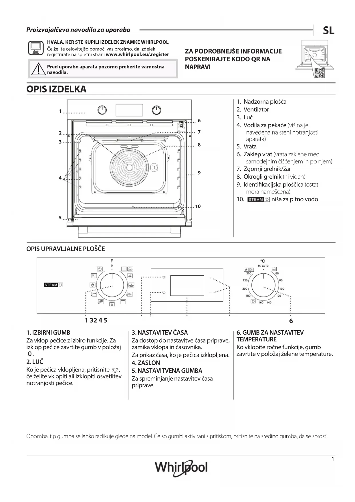 - Na voljo le pri določenih modelih Do pravil uporabe, standardne dokumentacije in dodatnih informacij o izdelkih lahko dostopate na naslednje načine:• Uporaba QR-kode v vaši napravi• Obiščite našo spletno stran docs . whirlpool . eu