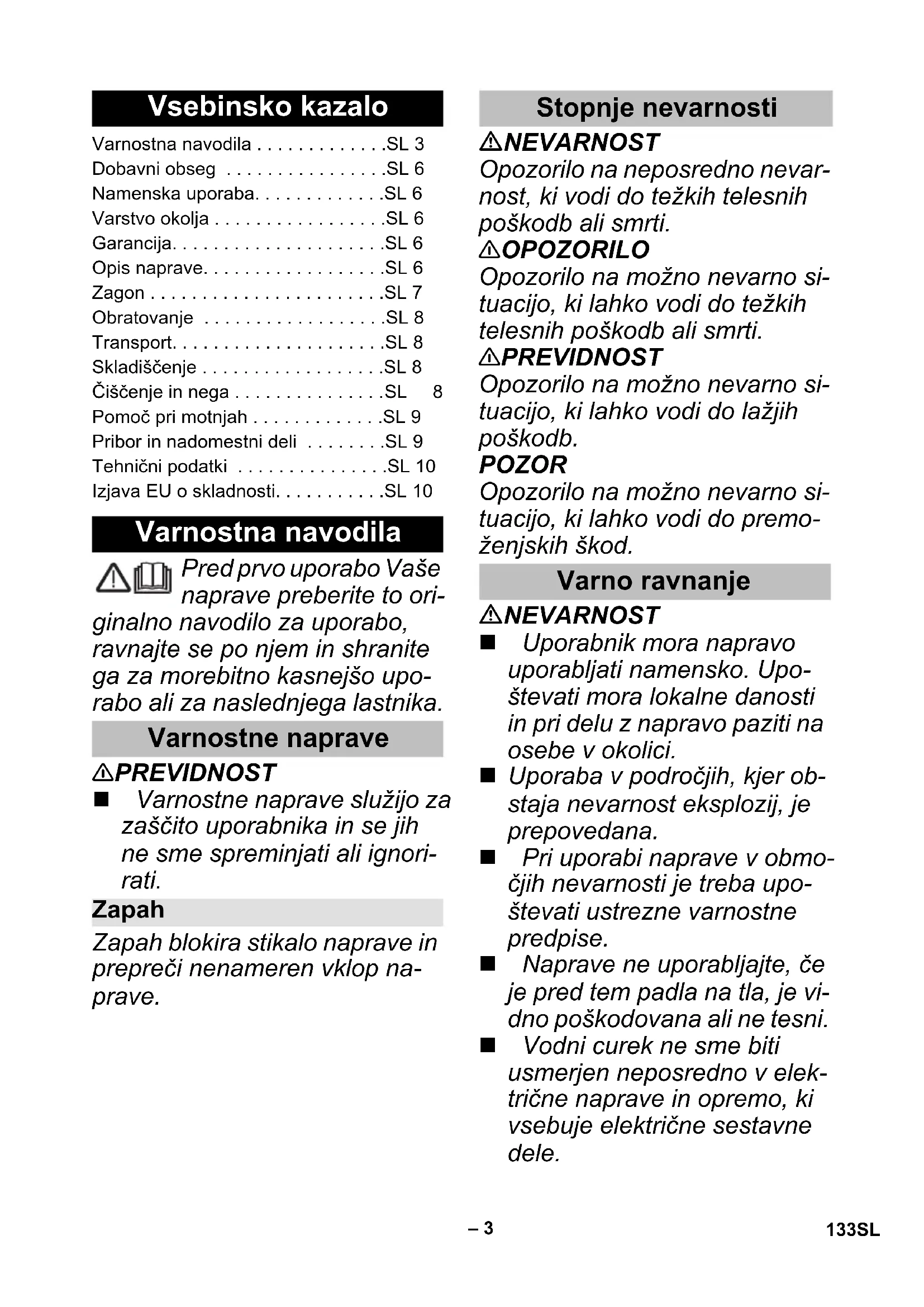 Hmotnost (bez akumulátorového blo- ku) 0,16 kg EU prohlášení o shodě Výrobek: Tlakový čistič (poháněný akumuláto- rem) Typ: 1.328-000 1.328-1xx Příslušné směrnice EU: 2014/35/EU 2014/35/EU 2014/30/EU 2014/30/EU 2011/65/EU 2011/65/EU 2000/14/ES – Použité harmonizační normy EN 60335–1 EN 60335–1 – EN 60335-2-29 EN 60335–2–54 EN 60335–2–54 EN 62233: 2008 EN 62233: 2008 EN 55014–1:2017 EN 55014–1:2017 EN 55014–2: 2015 EN 55014–2: 2015 – EN 61000–3–2: 2014 – EN 61000–3–3: 2013 EN 50581 EN 50581 Použitý postup posuzování shody: 2000/14/ES: Příloha V Hladinu akustického dB(A) Namerenou: 82 Garantovanou: 84 Chairman of the Board of Management Director Regulatory Affairs & Certification 132 CS– 3 Pred prvo uporabo Vaše naprave preberite to ori- ginalno navodilo za uporabo, ravnajte se po njem in shranite ga za morebitno kasnejšo upo- rabo ali za naslednjega lastnika. 몇 PREVIDNOST Varnostne naprave služijo za zaščito uporabnika in se jih ne sme spreminjati ali ignori- rati. Zapah blokira stikalo naprave in prepreči nenameren vklop na- prave. NEVARNOST Opozorilo na neposredno nevar- nost, ki vodi do težkih telesnih poškodb ali smrti. 몇 OPOZORILO Opozorilo na možno nevarno si- tuacijo, ki lahko vodi do težkih telesnih poškodb ali smrti. 몇 PREVIDNOST Opozorilo na možno nevarno si- tuacijo, ki lahko vodi do lažjih poškodb. POZOR Opozorilo na možno nevarno si- tuacijo, ki lahko vodi do premo- ženjskih škod. NEVARNOST Uporabnik mora napravo uporabljati namensko. Upo- števati mora lokalne danosti in pri delu z napravo paziti na osebe v okolici. Uporaba v področjih, kjer ob- staja nevarnost eksplozij, je prepovedana. Pri uporabi naprave v obmo- čjih nevarnosti je treba upo- števati ustrezne varnostne predpise. Naprave ne uporabljajte, če je pred tem padla na tla, je vi- dno poškodovana ali ne tesni. Vodni curek ne sme biti usmerjen neposredno v elek- trične naprave in opremo, ki vsebuje električne sestavne dele. Vsebinsko kazalo Varnostna navodila . . . . . . . . . . . . .SL 3 Dobavni obseg . . . . . . . . . . . . . . . .SL 6 Namenska uporaba. . . . . . . . . . . . .SL 6 Varstvo okolja . . . . . . . . . . . . . . . . .SL 6 Garancija. . . . . . . . . . . . . . . . . . . . .SL 6 Opis naprave. . . . . . . . . . . . . . . . . .SL 6 Zagon . . . . . . . . . . . . . . . . . . . . . . .SL 7 Obratovanje . . . . . . . . . . . . . . . . . .SL 8 Transport. . . . . . . . . . . . . . . . . . . . .SL 8 Skladiščenje . . . . . . . . . . . . . . . . . .SL 8 Čiščenje in nega . . . . . . . . . . . . . . .SL 8 Pomoč pri motnjah . . . . . . . . . . . . .SL 9 Pribor in nadomestni deli . . . . . . . .SL 9 Tehnični podatki . . . . . . . . . . . . . . .SL 10 Izjava EU o skladnosti. . . . . . . . . . .SL 10 Varnostna navodila Varnostne naprave Zapah Stopnje nevarnosti Varno ravnanje 133SL– 4 Ne škropite predmetov, ki vsebujejo zdravju škodljive snovi (npr. azbest). 몇 OPOZORILO S strojem ne smejo delati otroci, mladoletne ali neuspo- sobljene osebe. Ta naprava ni namenjena uporabi oseb z omejenimi fi- zičnimi, senzoričnimi ali du- ševnimi sposobnostmi ali po- manjkljivimi izkušnjami in/ali pomanjkljivim znanjem, razen če jih nadzoruje oseba, pri- stojna za njihovo varnost, ali so od nje prejeli navodila, kako napravo uporabljati, ter so razumeli nevarnosti, ki iz tega izhajajo. Otroci se z napravo ne smejo igrati. Nadzorujte otroke, da zagoto- vite, da se z napravo ne igra- jo. Napravo uporabljajte ali shra- njujte le v skladu z opisom oz. sliko! Curka nikoli ne usmerite proti ljudem, živalim ali predme- tom! Naprava vsebuje električne komponente - ne čistite je pod tekočo vodo. V skladu z veljavnimi predpisi uporaba naprave v omrežju pitne vode ni dovoljena brez sistemskega ločilnika. Zago- tovite, da je priključek vašega sistema za gospodinjsko vo- do, s katerim je povezana na- prava, opremljen s sistem- skim ločilnikom v skladu z EN 12729, tip BA. Vodo, ki je tekla skozi sistem- ski ločevalnik, se ne smatra več kot pitno vodo. 몇 PREVIDNOST Suhi tek lahko poškoduje na- pravo. Dokler naprava deluje, je ni- koli ne puščajte brez nadzo- ra. POZOR Naprave ne uporabljajte pri temperaturah pod 0 °C. Simboli na napravi Naprave se ne sme pri- ključiti neposredno na javno omrežje pitne vode. 134 SL– 5 NEVARNOST Pred vsako uporabo preveri- te, ali so vtični adapter, pove- zovalni kabel, akumulatorski adapter in paket akumulator- skih baterij poškodovani. Po- škodovanih naprav ne upora- bljajte in jih ne zamenjajte. Polnilnika ne odpirajte. Če se polnilnik poškoduje ali okvari, ga je treba zamenjati. Polnilnika ne smete upora- bljati v eksplozivno ogrože- nem okolju. Električnega vtiča in vtičnice nikoli ne prijemajte z vlažnimi rokami. Umazanega ali vlažnega pol- nilnika ne uporabljajte. Ne polnite navadnih baterij (primarnih celic), nevarnost eksplozije. 몇 PREVIDNOST Omrežna napetost mora ustrezati napetosti navedeni na tipski tablici polnilnika. Polnilnik uporabljajte le za polnjenje atestiranih akumu- latorskih baterij. Polnjenje paketa akumulator- skih baterij je dovoljeno samo s priloženim originalnim pol- nilnikom ali polnilnikom, ki ga je odobrilo podjetje KÄR- CHER. POZOR Polnilnika ne nosite tako, da držite za povezovalni kabel. Povezovalni kabel ščitite pred vročino, ostrimi robovi, oljem in premikajočimi se deli na- prave. Vtičnega adapterja ne pokri- vajte. Ne uporabljajte kabelskega podaljška z razdelilniki in izo- gibajte se sočasni uporabi več naprav. Povezovalnega kabla ne za- vijajte okoli vtičnega adapter- ja oziroma izogibajte se po- škodbam akumulatorskega adapterja. Obvezno preberite varnostna navodila, priložena paketu akumulatorskih baterij, in jih upoštevajte pri uporabi! Varnostna navodila za polnilnik Simboli na polnilniku Polnilnik zavarujte pred vlago in ga hranite na su- hem mestu. Naprava je primerna le za notranjo uporabo, ne sme se izpo- stavlja