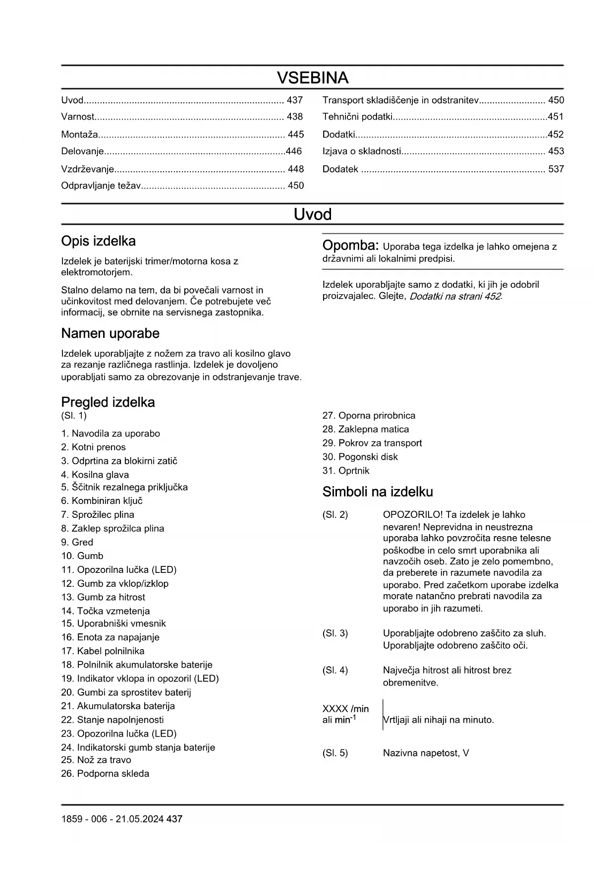1859 - 006 - 21.05.2024• Ko uporabljate rezilo za travo, se prepričajte, da so na izdelek nameščeni pravilen ročaj, ščitnik rezila in oprtnik.