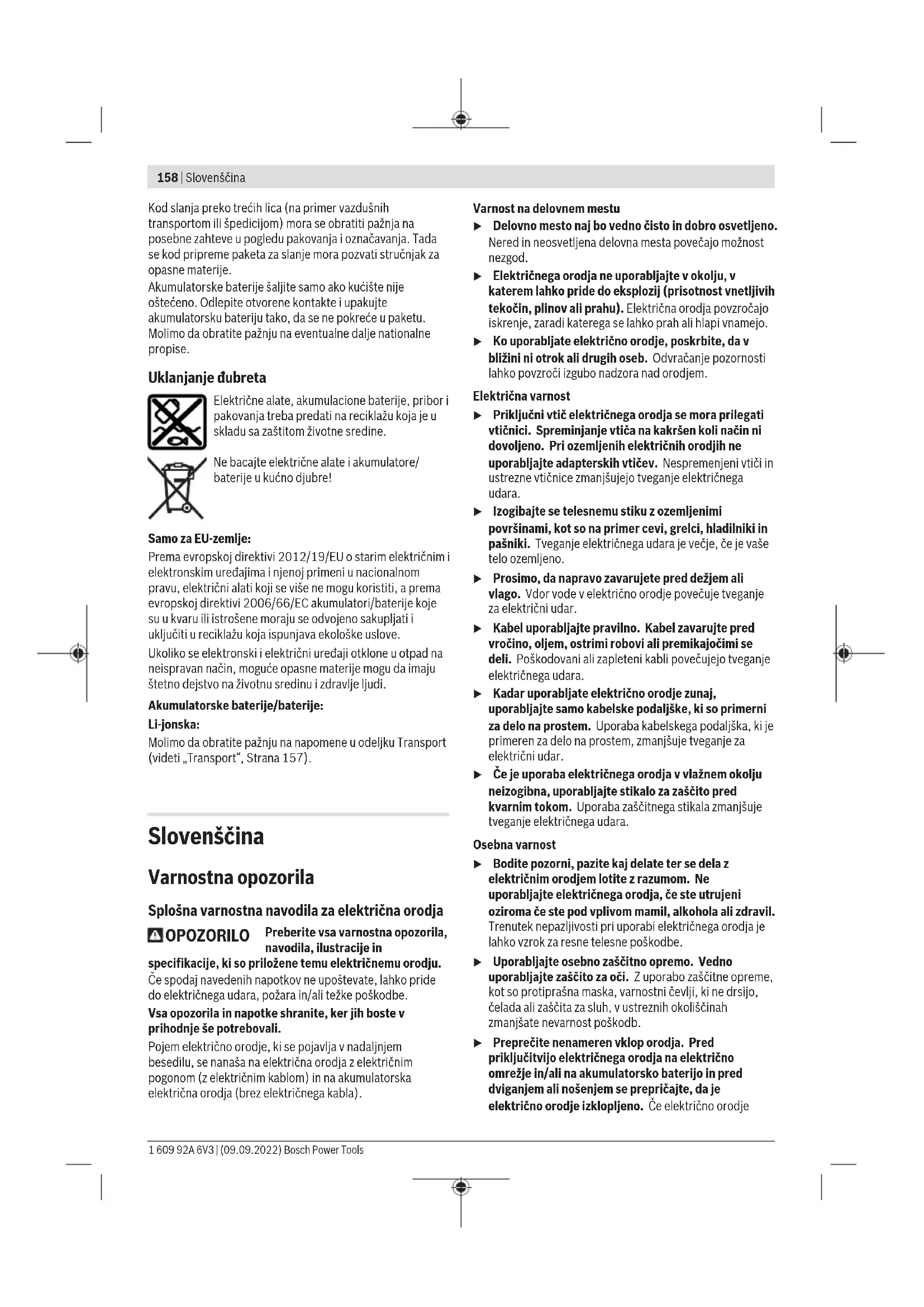 6mm 2–20 8mm 10–40 10mm 20–60 12mm 30–80 – Snagu udarca podesite na najveći stepen. – Umetnite odgovarajuću traku spajalica(14). – Glave heftalice za papir/odstojnika(13) jednu za drugom pričvrstite u otvore za heftalicu za papir(11) na električnom alatu. Imajte na umu da samo otvor1 odgovara za heftanje papira. – Papire stavite u heftalicu za papir/odstojnik(13) i glavu heftalice pozicionirajte iznad dela papira koje želite da zaheftate. – Električni alat pritisnite čvrsto nadole, tako da glava heftalice(1) bude potpuno utisnuta. – Održavajte pritisak i kratko pritisnite okidač(2). – Nakon potpunog zakivanja spajalice, otpustite okidač(2) i podignite glavu heftalice(1) sa papira. Heftanje sa ravnomernim rastojanjem od ivice materijala (videtislikeC1−C2) Napomena: Odstojnik(13) za heftanje sa ravnomernim rastojanjem mora ravnomerno da ulegne u otvore(10) na električnom alatu. Otvori 2–7(10) Rastojanje Otvor 2 1cm Otvor 3 3cm Otvor 4 5cm Otvor 5 7cm Otvor 6 9cm Otvor 7 11cm – Umetnite odgovarajuću traku spajalica(14) ili traku eksera(15). – Glave heftalice za papir/odstojnika(13) jednu za drugom pričvrstite u otvor(10) na električnom alatu koji označava odgovarajuće rastojanje od ivice materijala. Imajte na umu da otvor1 ne odgovara za heftanje sa ravnomernim rastojanjem. – Pritisnite fleksibilnu donju stranu heftalice za papir/ odstojnika(13) u smeru električnog alata tako da ulegne. – Električni alat vodite ravno preko radnog komada, tako da se ivica radnog komada nalazi na prednjoj ivici heftalice za papir/odstojnika(13). – Električni alat pritisnite čvrsto nadole, tako da glava heftalice(1) bude potpuno utisnuta. – Održavajte pritisak i kratko pritisnite okidač(2). – Nakon potpunog zakivanja spajalice/eksera, otpustite okidač(2) i pomerite glavu heftalice(1) duž ivice radnog komada. – Postavite sledeću spajalicu ili sledeći ekser. Održavanje i servis Održavanje i čišćenje u Izvadite bateriju pre svih radova na električnom alatu (na primer održavanja, promene pribora itd.) kao i kod njegovog transporta i čuvanja. Kod slučajnog aktiviranja prekidača za uključivanje/isključivanje postoji opasnost od povrede. u Držite električni alat i proreze za ventilaciju čiste, da bi dobro i sigurno radili. Servis i saveti za upotrebu Servis odgovara na vaša pitanja u vezi sa popravkom i održavanjem vašeg proizvoda kao i u vezi sa rezervnim delovima. Šematske prikaze i informacije u vezi rezervnih delova naći ćete i pod: www.bosch-pt.com Bosch tim za konsultacije vam rado pomaže tokom primene, ukoliko imate pitanja o našim proizvodima i njihovom priboru. Molimo da kod svih pitanja i naručivanja rezervnih delova neizostavno navedete broj artikla sa 10brojčanih mesta prema tipskoj pločici proizvoda. Srpski Bosch Elektroservis Dimitrija Tucovića 59 11000 Beograd Tel.: +381 11 644 8546 Tel.: +381 11 744 3122 Tel.: +381 11 641 6291 Fax: +381 11 641 6293 E-Mail: office@servis-bosch.rs www.bosch-pt.rs Dodatne adrese servisa pogledajte na: www.bosch-pt.com/serviceaddresses Transport Preporučeni litijum-jonski akumulatori podležu zahtevima propisa o opasnim materijama. Korisnik može bez dodatnih uslova transportovati akumulatore na drumu. Bosch Power Tools 1 609 92A 6V3 | (09.09.2022)158 | Slovenščina Kod slanja preko trećih lica (na primer vazdušnih transportom ili špedicijom) mora se obratiti pažnja na posebne zahteve u pogledu pakovanja i označavanja. Tada se kod pripreme paketa za slanje mora pozvati stručnjak za opasne materije. Akumulatorske baterije šaljite samo ako kućište nije oštećeno. Odlepite otvorene kontakte i upakujte akumulatorsku bateriju tako, da se ne pokreće u paketu. Molimo da obratite pažnju na eventualne dalje nationalne propise. Uklanjanje đubreta Električne alate, akumulacione baterije, pribor i pakovanja treba predati na reciklažu koja je u skladu sa zaštitom životne sredine. Ne bacajte električne alate i akumulatore/ baterije u kućno djubre! Samo za EU‑zemlje: Prema evropskoj direktivi 2012/19/EU o starim električnim i elektronskim uređajima i njenoj primeni u nacionalnom pravu, električni alati koji se više ne mogu koristiti, a prema evropskoj direktivi 2006/66/EC akumulatori/baterije koje su u kvaru ili istrošene moraju se odvojeno sakupljati i uključiti u reciklažu koja ispunjava ekološke uslove. Ukoliko se elektronski i električni uređaji otklone u otpad na neispravan način, moguće opasne materije mogu da imaju štetno dejstvo na životnu sredinu i zdravlje ljudi. Akumulatorske baterije/baterije: Li-jonska: Molimo da obratite pažnju na napomene u odeljku Transport (videti „Transport“, Strana157). Slovenščina Varnostna opozorila Splošna varnostna navodila za električna orodja OPOZORILO Preberite vsa varnostna opozorila, navodila, ilustracije in specifikacije, ki so priložene temu električnemu orodju. Če spodaj navedenih napotkov ne upoštevate, lahko pride do električnega udara, požara in/ali težke poškodbe. Vsa opozorila in napotke shranite, ker jih boste v prihodnje še potrebovali. Pojem električno orodje, ki se pojavlja v nadaljnjem besedilu, se nanaša na električna orodja z električnim pogonom (z električnim kablom) in na akumulatorska električna orodja (brez električnega kabla). Varnost na delovnem mestu u Delovno mesto naj bo vedno čisto in dobro osvetljeno. Nered in neosvetljena delovna mesta povečajo možnost nezgod. u Električnega orodja ne uporabljajte v okolju, v katerem lahko pride do eksplozij (prisotnost vnetljivih tekočin, plinov ali prahu). Električna orodja povzročajo iskrenje, zaradi katerega se lahko prah ali hlapi vnamejo. u Ko uporabljate električno orodje, poskrbite, da v bližini ni otrok ali drugih oseb. Odvračanje pozornosti lahko povzroči izgubo nadzora nad orodjem. Električna varnost u Priključni vtič električnega orodja se mora prilegati vtičnici. Spreminjanje vtiča na kakršen koli 