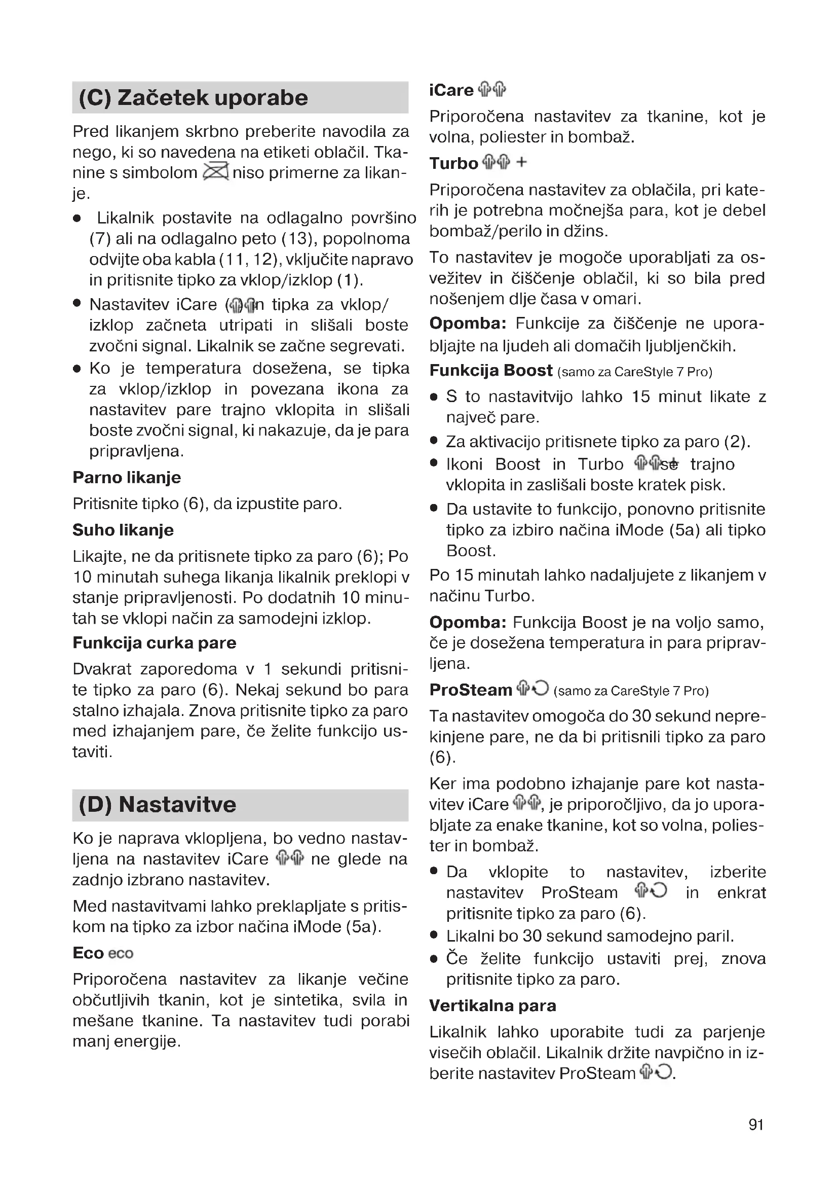Ko je temperatura dosežena, se tipka za vklop/izklop in povezana ikona za nastavitev pare trajno vklopita in slišali boste zvočni signal, ki nakazuje, da je para pripravljena. Parno likanje Pritisnite tipko (6), da izpustite paro. Suho likanje Likajte, ne da pritisnete tipko za paro (6); Po 10 minutah suhega likanja likalnik preklopi v stanje pripravljenosti. Po dodatnih 10 minu- tah se vklopi način za samodejni izklop. Funkcija curka pare Dvakrat zaporedoma v 1 sekundi pritisni- te tipko za paro (6). Nekaj sekund bo para stalno izhajala. Znova pritisnite tipko za paro med izhajanjem pare, če želite funkcijo us- taviti. (D) Nastavitve Ko je naprava vklopljena, bo vedno nastav- ljena na nastavitev iCare ne glede na zadnjo izbrano nastavitev. Med nastavitvami lahko preklapljate s pritis- kom na tipko za izbor načina iMode (5a). Eco Priporočena nastavitev za likanje večine občutljivih tkanin, kot je sintetika, svila in mešane tkanine. Ta nastavitev tudi porabi manj energije. iCare Priporočena nastavitev za tkanine, kot je volna, poliester in bombaž. Turbo Priporočena nastavitev za oblačila, pri kate- rih je potrebna močnejša para, kot je debel bombaž/perilo in džins. To nastavitev je mogoče uporabljati za os- vežitev in čiščenje oblačil, ki so bila pred nošenjem dlje časa v omari. Opomba: Funkcije za čiščenje ne upora- bljajte na ljudeh ali domačih ljubljenčkih. Funkcija Boost (samo za CareStyle 7 Pro)