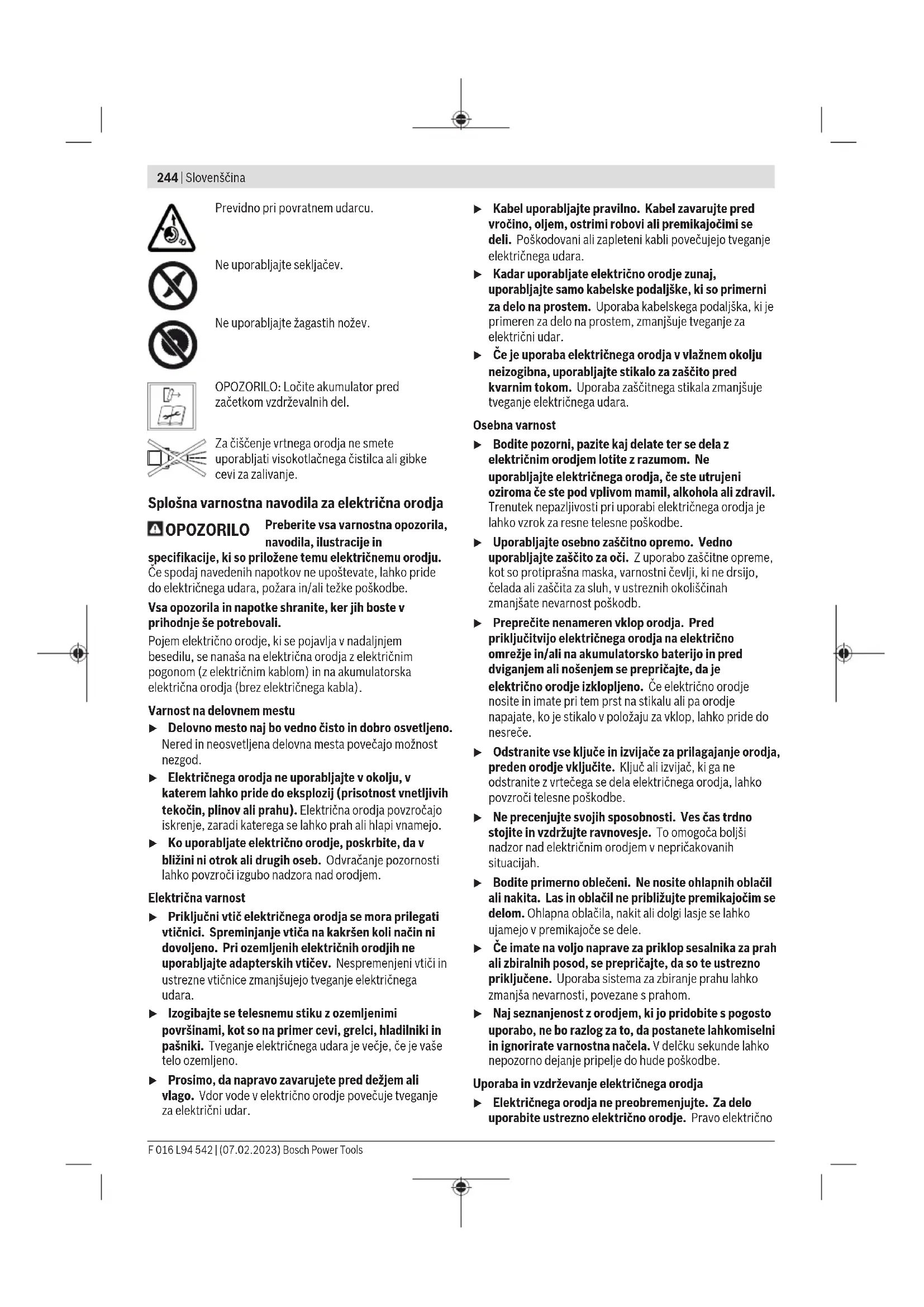 = 1,3 = 1,3 Da je bila podana skupna vrednost/so bile podane skupne vrednosti nihanja in podana vrednost/podane vrednosti zvočnih emisij izmerjena/izmerjene po standardiziranem kontrolnem postopku in se jo/jih lahko uporablja kot primerjavo za drugo električno orodje. Da je mogoče uporabljati podano skupno vrednost/podane skupne vrednosti nihanja in podano vrednost/podane vrednosti zvočnih emisij tudi za začasno oceno obremenitve. Da lahko odstopajo nihajne emisije in emisije hrupa med dejansko uporabo električnega orodja od podanih vrednosti, glede na to, kako se uporablja električno orodje in še posebej od tega, kateri obdelovanec je v delu; le te pa je treba zaradi potrebe zavarovanja in zaščite uporabnika orodja določati, na podlagi obremenitve zaradi nihanja orodja v času njegove dejanske uporabe v realnih okoliščinah (pri čemer je treba upoštevati vse dejavnike obratovalnega cikla, kot so na primer časi, v katerih je električno orodje izklopljeno, in časi, v katerih je orodje sicer vklopljeno, vendar deluje brez obremenitve). Akumulatorska baterija PodjetjeBosch prodaja akumulatorska električna orodja tudi brez priložene akumulatorske baterije. Ali je v obseg dobave vključena tudi akumulatorska baterija, je navedeno na embalaži. Polnjenje akumulatorske baterije u Uporabljajte samo polnilnike, ki so navedeni v tehničnih podatkih. Samo ti polnilniki so usklajeni z litij- ionsko akumulatorsko baterijo, ki je nameščena v električnem orodju. Opomba: litij-ionske akumulatorske baterije se zaradi mednarodnih transportnih predpisov dobavljajo delno napolnjene. Da zagotovite polno zmogljivost akumulatorske baterije, jo pred prvo uporabo popolnoma napolnite. Namestitev akumulatorske baterije Napolnjeno akumulatorsko baterijo vstavite v ležišče za akumulatorsko baterijo, da se zaskoči. Odstranitev akumulatorske baterije Akumulatorsko baterijo odstranite tako, da pritisnete tipko za sprostitev akumulatorske baterije in izvlečete akumulatorsko baterijo. Pri tem ne uporabljajte sile. Akumulatorska baterijaima 2 ravni zapore, ki preprečujeta, da bi akumulatorska baterija ob nenamernem pritisku tipke za sprostitev akumulatorske baterijeizpadla. Ko je akumulatorska baterija vstavljena v električno orodje, jo varuje vzmet. Prikaz stanja napolnjenosti akumulatorske baterije Tri zelene LED-lučke prikaza stanja napolnjenosti akumulatorske baterije prikazujejo stanje napolnjenosti akumulatorske baterije. Iz varnostnih razlogov je stanje napolnjenosti mogoče prikazati le, ko je električno orodje izklopljeno. Za prikaz stanja napolnjenosti pritisnite tipko ali na prikazu stanja napolnjenosti. To je mogoče tudi takrat, ko akumulatorska baterija ni vstavljena. Če po pritisku tipke za prikaz stanja napolnjenosti LED-diode ne zasvetijo, je akumulatorska baterija okvarjena in jo je treba zamenjati. Vrsta akumulatorske baterije GBA 18V... LED-dioda Napolnjenost 3zelene LED-diode neprekinjeno svetijo 60–100% 2zeleni LED-diodi neprekinjeno svetita 30–60% 1zelena LED-dioda neprekinjeno sveti 5–30% 1zelena LED-dioda utripa 0–5% Bosch Power Tools F 016 L94 542 | (07.02.2023)250 | Slovenščina Vrsta akumulatorske baterije ProCORE18V... LED-dioda Napolnjenost 5zelenih LED-diod neprekinjeno sveti 80–100% 4zelene LED-diode neprekinjeno svetijo 60–80% 3zelene LED-diode neprekinjeno svetijo 40–60% 2zeleni LED-diodi neprekinjeno svetita 20–40% 1zelena LED-dioda neprekinjeno sveti 5–20% 1zelena LED-dioda utripa 0–5% Navodila za optimalno uporabo akumulatorske baterije Akumulatorsko baterijo zavarujte pred vlago in vodo. Akumulatorsko baterijo skladiščite samo v temperaturnem območju od –20 °C do 50 °C. Poleti ne dovolite, da bi akumulatorska baterija obležala v avtomobilu. Prezračevalne reže akumulatorske baterije občasno očistite z mehkim, čistim in suhim čopičem. Bistveno krajši čas delovanja po polnjenju pomeni, da je akumulatorska baterija izrabljena in da jo je treba zamenjati. Upoštevajte navodila za odstranjevanje. Negovanje akumulatorske baterije Da bi zagotovili optimalno uporabo akumulatorske baterije, upoštevajte naslednja opozorila in ukrepe: – Akumulatorsko baterijo morate zavarovati pred vlago in vodo. – Električno orodje in akumulatorsko baterijo skladiščite v temperaturnem območju od -20°C do 50°C. Npr. poleti akumulatorske baterije ne smete pustiti ležati na soncu v avtomobilu. – Skladiščite akumulatorsko baterijo ločeno in ne v vrtnem orodju. – Ne puščajte akumulatorske baterije v vrtnem orodju, ko sonce direktno sije nanj. – Optimalna temperatura za shranjevanje akumulatorske baterije znaša 5 °C. – Zračne reže akumulatorske baterije občasno očistite z mehkim, čistim in suhim čopičem. Močno skrajšan čas delovanja po napolnitvi nakazuje, da je akumulatorska baterija izrabljena in se mora nadomestiti. Montaža in obratovanje Cilj delovanja Slika Stran Komponente na sliki