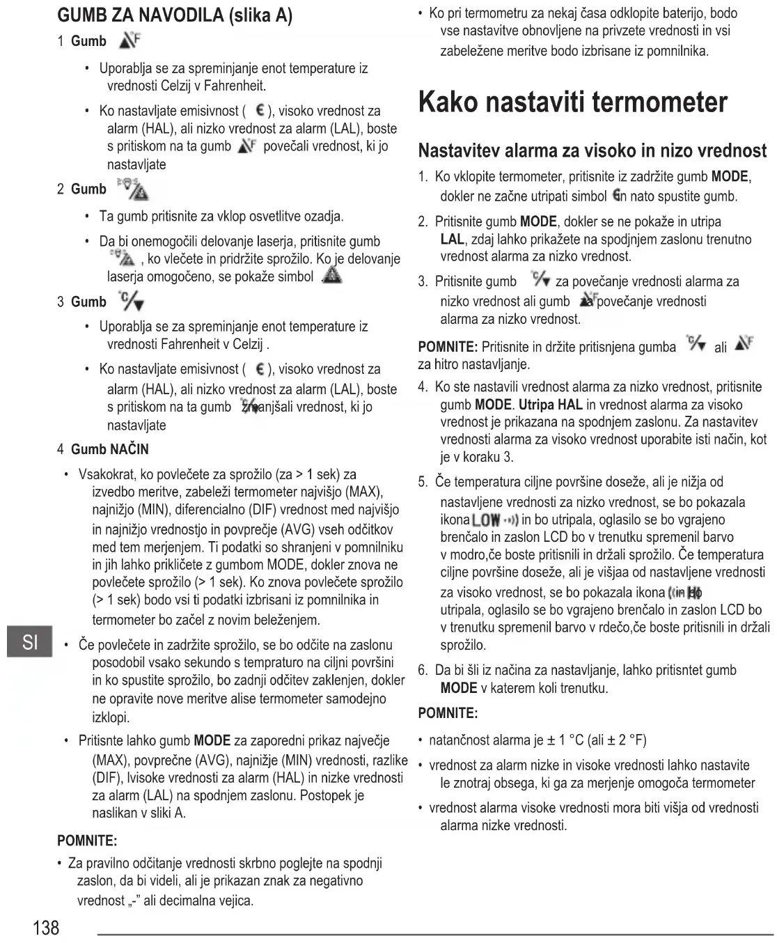 - vrednost za alarm nizke in visoke vrednosti lahko nastavite le znotraj obsega, ki ga za merjenje omogoča termometer