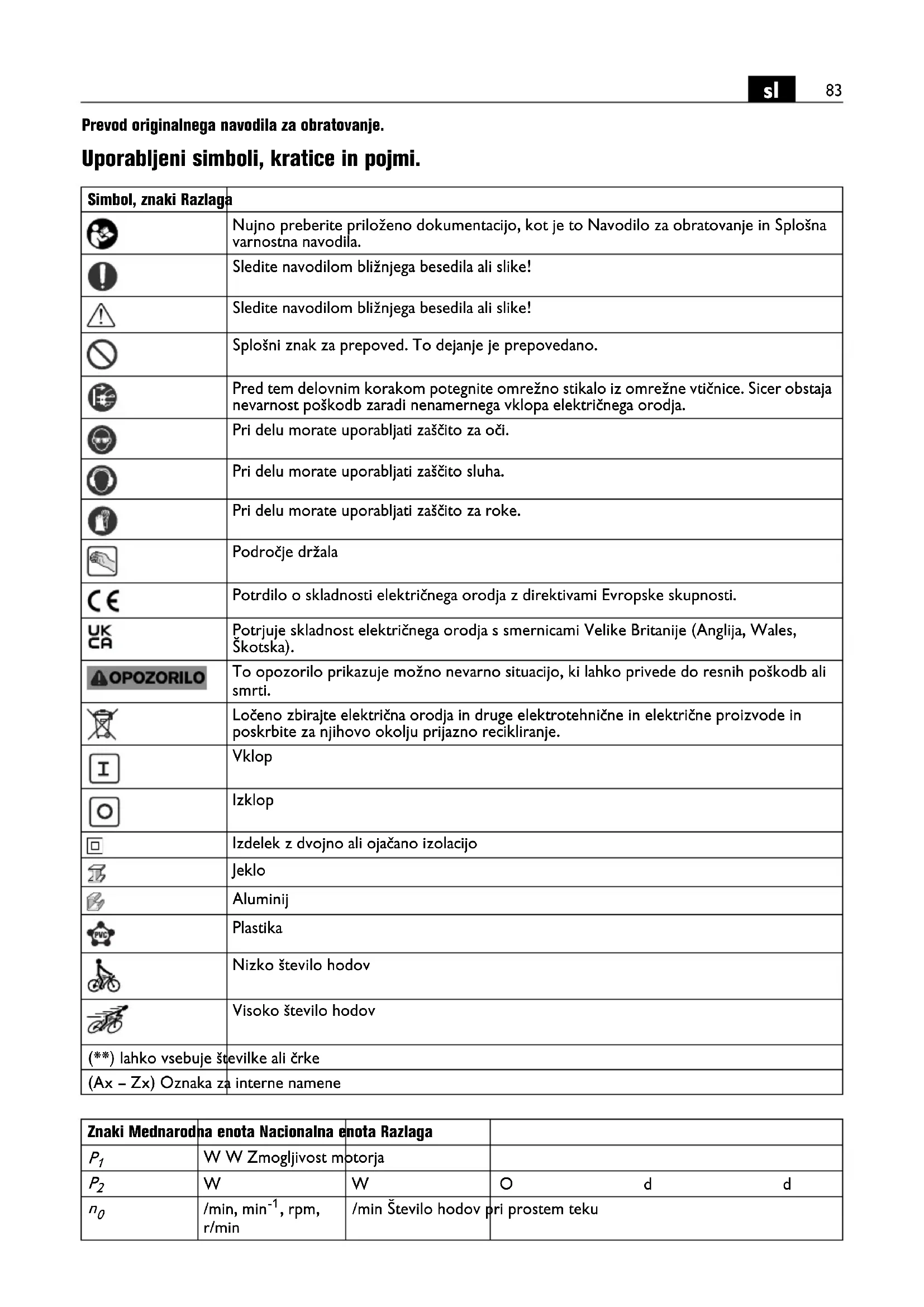Prevod originalnega navodila za obratovanje. Uporabljeni simboli, kratice in pojmi. Simbol, znaki Razlaga Nujno preberite priloženo dokumentacijo, kot je to Navodilo za obratovanje in Splošna varnostna navodila. Sledite navodilom bližnjega besedila ali slike! Sledite navodilom bližnjega besedila ali slike! Splošni znak za prepoved. To dejanje je prepovedano. Pred tem delovnim korakom potegnite omrežno stikalo iz omrežne vtičnice. Sicer obstaja nevarnost poškodb zaradi nenamernega vklopa električnega orodja. Pri delu morate uporabljati zaščito za oči. Pri delu morate uporabljati zaščito sluha. Pri delu morate uporabljati zaščito za roke. Področje držala Potrdilo o skladnosti električnega orodja z direktivami Evropske skupnosti. Potrjuje skladnost električnega orodja s smernicami Velike Britanije (Anglija, Wales, Škotska). To opozorilo prikazuje možno nevarno situacijo, ki lahko privede do resnih poškodb ali smrti. Ločeno zbirajte električna orodja in druge elektrotehnične in električne proizvode in poskrbite za njihovo okolju prijazno recikliranje. Vklop Izklop Izdelek z dvojno ali ojačano izolacijo Jeklo Aluminij Plastika Nizko število hodov Visoko število hodov (**) lahko vsebuje številke ali črke (Ax – Zx) Oznaka za interne namene Znaki Mednarodna enota Nacionalna enota Razlaga