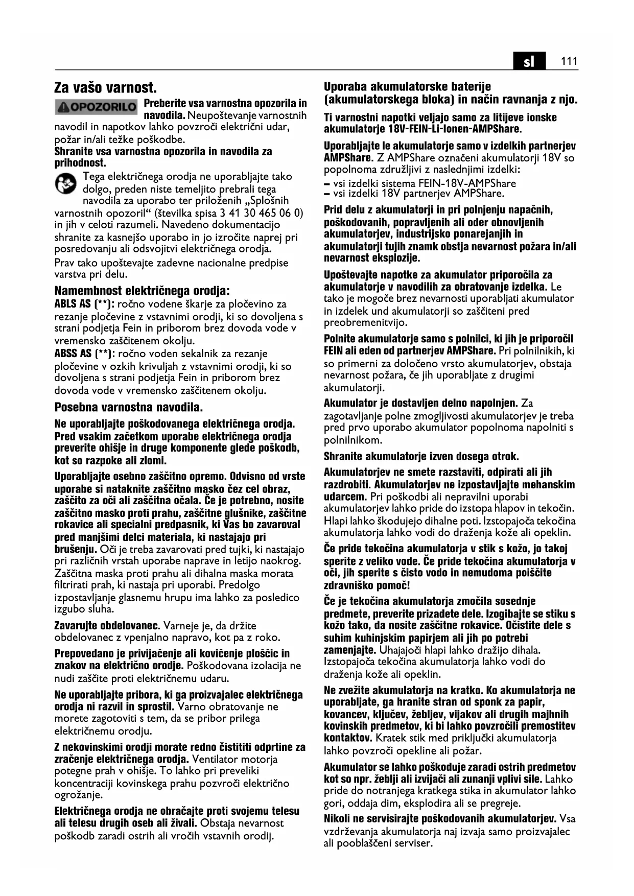 Za vašo varnost. Preberite vsa varnostna opozorila in navodila. Neupoštevanje varnostnih navodil in napotkov lahko povzroči električni udar, požar in/ali težke poškodbe. Shranite vsa varnostna opozorila in navodila za prihodnost. Tega električnega orodja ne uporabljajte tako dolgo, preden niste temeljito prebrali tega navodila za uporabo ter priloženih „Splošnih varnostnih opozoril“ (številka spisa 3 41 30 465 06 0) in jih v celoti razumeli. Navedeno dokumentacijo shranite za kasnejšo uporabo in jo izročite naprej pri posredovanju ali odsvojitvi električnega orodja. Prav tako upoštevajte zadevne nacionalne predpise varstva pri delu. Namembnost električnega orodja: ABLS AS (**): ročno vodene škarje za pločevino za rezanje pločevine z vstavnimi orodji, ki so dovoljena s strani podjetja Fein in priborom brez dovoda vode v vremensko zaščitenem okolju. ABSS AS (**): ročno voden sekalnik za rezanje pločevine v ozkih krivuljah z vstavnimi orodji, ki so dovoljena s strani podjetja Fein in priborom brez dovoda vode v vremensko zaščitenem okolju. Posebna varnostna navodila. Ne uporabljajte poškodovanega električnega orodja. Pred vsakim začetkom uporabe električnega orodja preverite ohišje in druge komponente glede poškodb, kot so razpoke ali zlomi. Uporabljajte osebno zaščitno opremo. Odvisno od vrste uporabe si nataknite zaščitno masko čez cel obraz, zaščito za oči ali zaščitna očala. Če je potrebno, nosite zaščitno masko proti prahu, zaščitne glušnike, zaščitne rokavice ali specialni predpasnik, ki Vas bo zavaroval pred manjšimi delci materiala, ki nastajajo pri brušenju. Oči je treba zavarovati pred tujki, ki nastajajo pri različnih vrstah uporabe naprave in letijo naokrog. Zaščitna maska proti prahu ali dihalna maska morata filtrirati prah, ki nastaja pri uporabi. Predolgo izpostavljanje glasnemu hrupu ima lahko za posledico izgubo sluha. Zavarujte obdelovanec. Varneje je, da držite obdelovanec z vpenjalno napravo, kot pa z roko. Prepovedano je privijačenje ali kovičenje ploščic in znakov na električno orodje. Poškodovana izolacija ne nudi zaščite proti električnemu udaru. Ne uporabljajte pribora, ki ga proizvajalec električnega orodja ni razvil in sprostil. Varno obratovanje ne morete zagotoviti s tem, da se pribor prilega električnemu orodju. Z nekovinskimi orodji morate redno čistititi odprtine za zračenje električnega orodja. Ventilator motorja potegne prah v ohišje. To lahko pri preveliki koncentraciji kovinskega prahu pozvroči električno ogrožanje. Električnega orodja ne obračajte proti svojemu telesu ali telesu drugih oseb ali živali. Obstaja nevarnost poškodb zaradi ostrih ali vročih vstavnih orodij. Uporaba akumulatorske baterije (akumulatorskega bloka) in način ravnanja z njo. Ti varnostni napotki veljajo samo za litijeve ionske akumulatorje 18V-FEIN-Li-Ionen-AMPShare. Uporabljajte le akumulatorje samo v izdelkih partnerjev AMPShare. Z AMPShare označeni akumulatorji 18V so popolnoma združljivi z naslednjimi izdelki: – vsi izdelki sistema FEIN-18V-AMPShare – vsi izdelki 18V partnerjev AMPShare. Prid delu z akumulatorji in pri polnjenju napačnih, poškodovanih, popravljenih ali oder obnovljenih akumulatorjev, industrijsko ponarejanjih in akumulatorji tujih znamk obstja nevarnost požara in/ali nevarnost eksplozije. Upoštevajte napotke za akumulator priporočila za akumulatorje v navodilih za obratovanje izdelka. Le tako je mogoče brez nevarnosti uporabljati akumulator in izdelek und akumulatorji so zaščiteni pred preobremenitvijo. Polnite akumulatorje samo s polnilci, ki jih je priporočil FEIN ali eden od partnerjev AMPShare. Pri polnilnikih, ki so primerni za določeno vrsto akumulatorjev, obstaja nevarnost požara, če jih uporabljate z drugimi akumulatorji. Akumulator je dostavljen delno napolnjen. Za zagotavljanje polne zmogljivosti akumulatorjev je treba pred prvo uporabo akumulator popolnoma napolniti s polnilnikom. Shranite akumulatorje izven dosega otrok. Akumulatorjev ne smete razstaviti, odpirati ali jih razdrobiti. Akumulatorjev ne izpostavljajte mehanskim udarcem. Pri poškodbi ali nepravilni uporabi akumulatorjev lahko pride do izstopa hlapov in tekočin. Hlapi lahko škodujejo dihalne poti. Izstopajoča tekočina akumulatorja lahko vodi do draženja kože ali opeklin. Če pride tekočina akumulatorja v stik s kožo, jo takoj sperite z veliko vode. Če pride tekočina akumulatorja v oči, jih sperite s čisto vodo in nemudoma poiščite zdravniško pomoč! Če je tekočina akumulatorja zmočila sosednje predmete, preverite prizadete dele. Izogibajte se stiku s kožo tako, da nosite zaščitne rokavice. Očistite dele s suhim kuhinjskim papirjem ali jih po potrebi zamenjajte. Uhajajoči hlapi lahko dražijo dihala. Izstopajoča tekočina akumulatorja lahko vodi do draženja kože ali opeklin. Ne zvežite akumulatorja na kratko. Ko akumulatorja ne uporabljate, ga hranite stran od sponk za papir, kovancev, ključev, žebljev, vijakov ali drugih majhnih kovinskih predmetov, ki bi lahko povzročili premostitev kontaktov. Kratek stik med priključki akumulatorja lahko povzroči opekline ali požar. Akumulator se lahko poškoduje zaradi ostrih predmetov kot so npr. žeblji ali izvijači ali zunanji vplivi sile. Lahko pride do notranjega kratkega stika in akumulator lahko gori, oddaja dim, eksplodira ali se pregreje. Nikoli ne servisirajte poškodovanih akumulatorjev. Vsa vzdrževanja akumulatorja naj izvaja samo proizvajalec ali pooblaščeni serviser.112