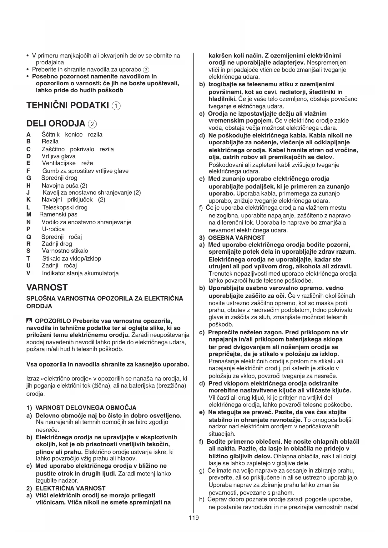P U-ročica Q Sprednji ročaj R Zadnji drog S Varnostno stikalo T Stikalo za vklop/izklop U Zadnji ročaj V Indikator stanja akumulatorja VARNOST SPLOŠNA VARNOSTNA OPOZORILA ZA ELEKTRIČNA ORODJA - OPOZORILO Preberite vsa varnostna opozorila, navodila in tehnične podatke ter si oglejte slike, ki so priloženi temu električnemu orodju. Zaradi neupoštevanja spodaj navedenih navodil lahko pride do električnega udara, požara in/ali hudih telesnih poškodb. Vsa opozorila in navodila shranite za kasnejšo uporabo. Izraz »električno orodje« v opozorilih se nanaša na orodja, ki jih poganja električni tok (žična), ali na baterijska (brezžična) orodja.