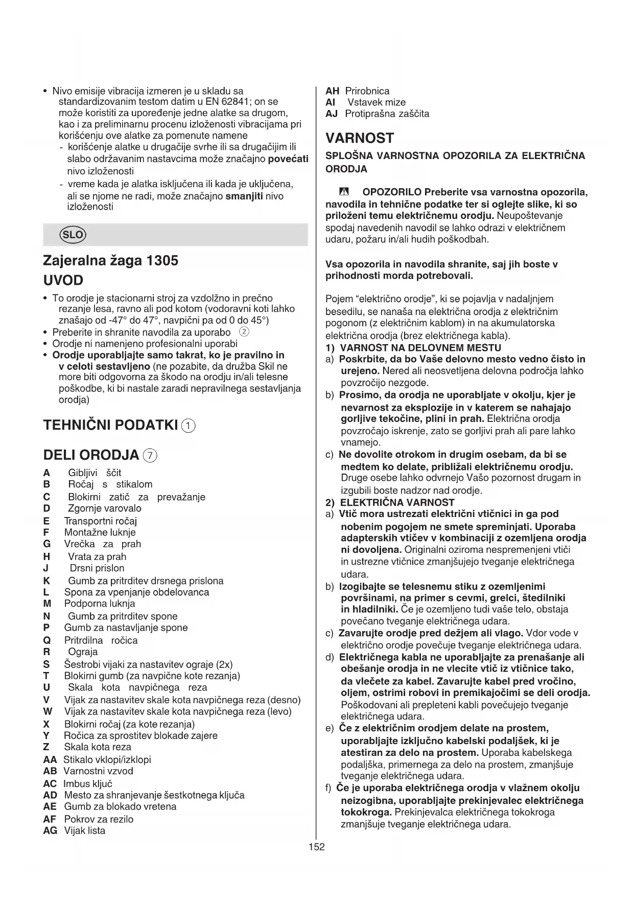 A Gibljivi ščit B Ročaj s stikalom C Blokirni zatič za prevažanje D Zgornje varovalo E Transportni ročaj F Montažne luknje G Vrečka za prah H Vrata za prah J Drsni prislon K Gumb za pritrditev drsnega prislona L Spona za vpenjanje obdelovanca M Podporna luknja N Gumb za pritrditev spone P Gumb za nastavljanje spone Q Pritrdilna ročica R Ograja S Šestrobi vijaki za nastavitev ograje (2x) T Blokirni gumb (za navpične kote rezanja) U Skala kota navpičnega reza V Vijak za nastavitev skale kota navpičnega reza (desno) W Vijak za nastavitev skale kota navpičnega reza (levo) X Blokirni ročaj (za kote rezanja) Y Ročica za sprostitev blokade zajere Z Skala kota reza AA Stikalo vklopi/izklopi AB Varnostni vzvod AC Imbus ključ AD Mesto za shranjevanje šestkotnega ključa AE Gumb za blokado vretena AF Pokrov za rezilo AG Vijak lista153 njegovo delovanje. Pred nadaljnjo uporabo je potrebno poškodovani del popraviti. Vzrok za številne nezgode so ravno slabo vzdrževana električna orodja. f) Rezalna orodja naj bodo ostra in čista. Skrbno negovana rezalna orodja z ostrimi rezili se manj zatikajo in so bolje vodljiva. g) Električna orodja, pribor, nastavke in podobno uporabljajte v skladu s temi navodili. Pri tem upoštevajte delovne pogoje in vrsto dela, ki ga nameravate opraviti. Zaradi uporabe električnega orodja v druge, nepredvidene namene, lahko nastanejo nevarne situacije. h) Ročaji in površine za prijemanje naj bodo suhe, čiste in brez olja ali maščobe. Gladki ročaji in površine za prijemanje ne omogočajo varne uporabe in nadzora orodja v nepričakovanih situacijah.