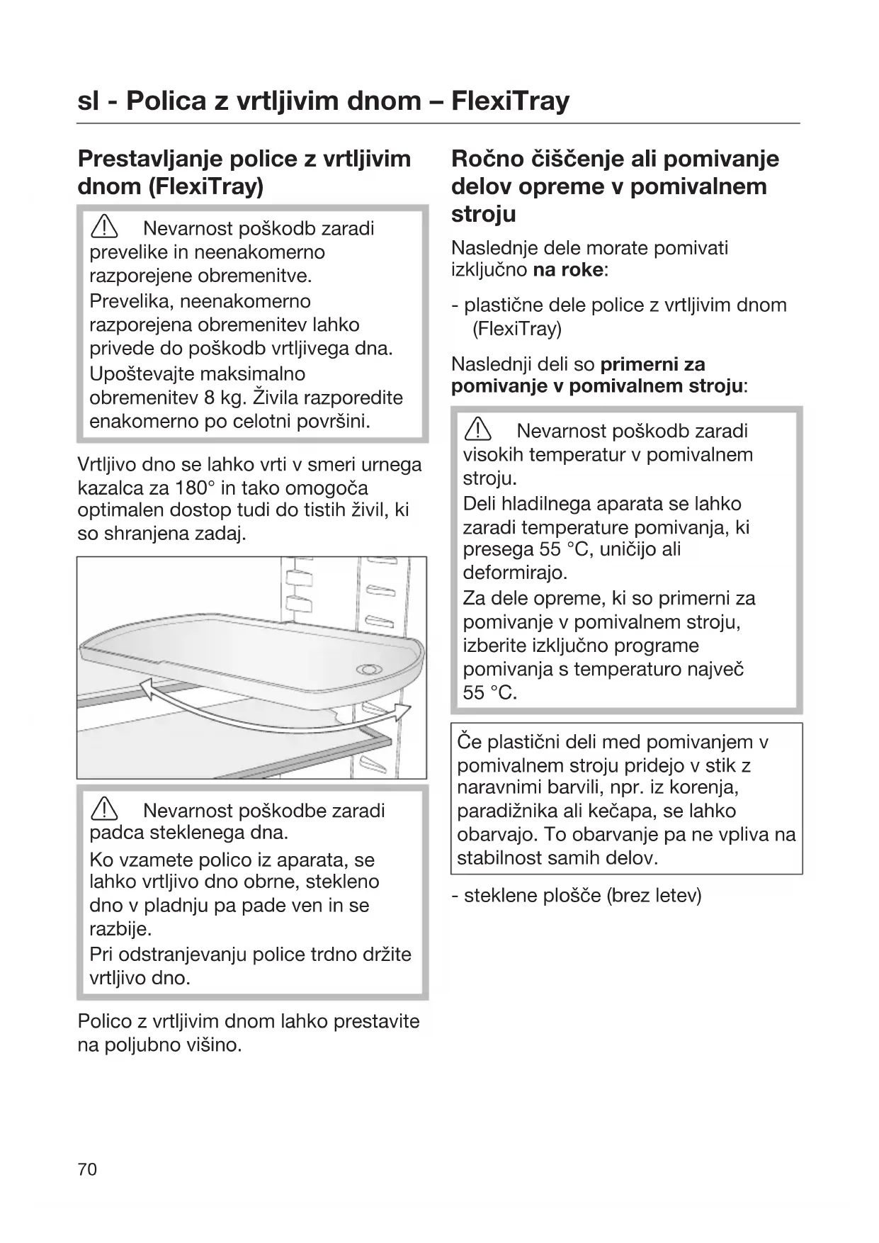 Prestavljanje police z vrtljivim dnom (FlexiTray) Nevarnost poškodb zaradi prevelike in neenakomerno razporejene obremenitve. Prevelika, neenakomerno razporejena obremenitev lahko privede do poškodb vrtljivega dna. Upoštevajte maksimalno obremenitev 8kg. Živila razporedite enakomerno po celotni površini. Vrtljivo dno se lahko vrti v smeri urnega kazalca za 180° in tako omogoča optimalen dostop tudi do tistih živil, ki so shranjena zadaj. Nevarnost poškodbe zaradi padca steklenega dna. Ko vzamete polico iz aparata, se lahko vrtljivo dno obrne, stekleno dno v pladnju pa pade ven in se razbije. Pri odstranjevanju police trdno držite vrtljivo dno. Polico z vrtljivim dnom lahko prestavite na poljubno višino. Ročno čiščenje ali pomivanje delov opreme v pomivalnem stroju Naslednje dele morate pomivati izključno na roke: - plastične dele police z vrtljivim dnom (FlexiTray) Naslednji deli so primerni za pomivanje v pomivalnem stroju: Nevarnost poškodb zaradi visokih temperatur v pomivalnem stroju. Deli hladilnega aparata se lahko zaradi temperature pomivanja, ki presega 55°C, uničijo ali deformirajo. Za dele opreme, ki so primerni za pomivanje v pomivalnem stroju, izberite izključno programe pomivanja s temperaturo največ 55°C. Če plastični deli med pomivanjem v pomivalnem stroju pridejo v stik z naravnimi barvili, npr. iz korenja, paradižnika ali kečapa, se lahko obarvajo. To obarvanje pa ne vpliva na stabilnost samih delov. - steklene plošče (brez letev)sl - Polica z vrtljivim dnom – FlexiTray