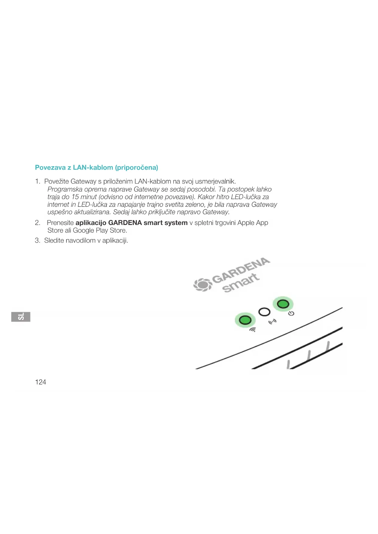 Iskrene čestitke! Izbrali ste izdelek vrhunske kakovosti. Če imate vprašanja v zvezi z namestitvijo ali uporabo svojega izdelka, se obrnite na naš GARDENA servis na www.gardena.de/service Obseg dobave: 1 x smart Gateway 1 x napajalnik 1 x LAN-kabel Zagon Naprava Gateway vam nudi dve možnosti za vzpostavitev povezave z internetom. Povezavo z LAN-kablom ali z WLAN-omrežjem.