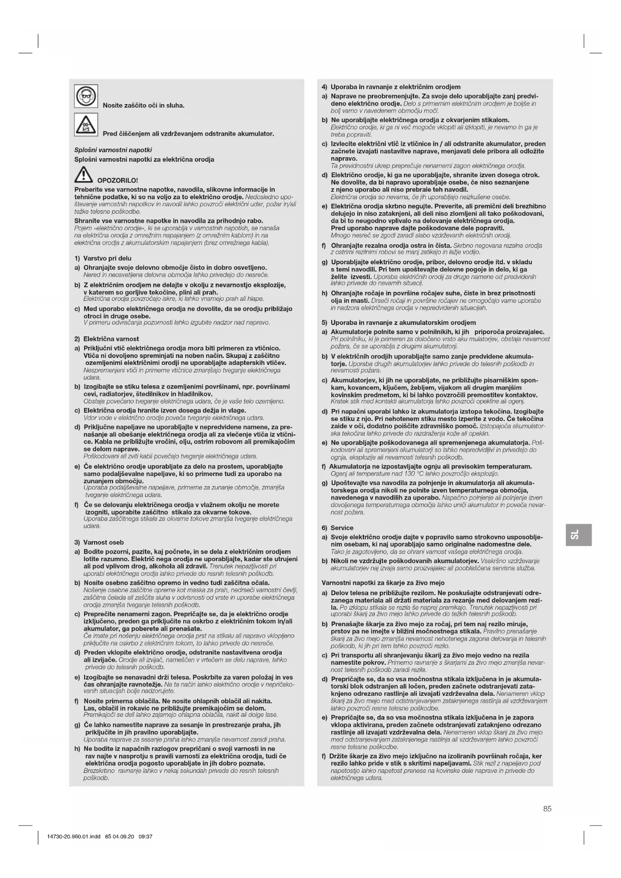 Pred čiščenjem ali vzdrževanjem odstranite akumulator. Splošni varnostni napotki Splošni varnostni napotki za električna orodja OPOZORILO! Preberite vse varnostne napotke, navodila, slikovne informacije in tehnične podatke, ki so na voljo za to električno orodje. Nedosledno upo- števanje varnostnih napotkov in navodil lahko povzroči električni udar, požar in/ali težke telesne poškodbe. Shranite vse varnostne napotke in navodila za prihodnjo rabo. Pojem »električno orodje«, ki se uporablja v varnostnih napotkih, se nanaša na električna orodja z omrežnim napajanjem (z omrežnim kablom) in na električna orodja z akumulatorskim napajanjem (brez omrežnega kabla).