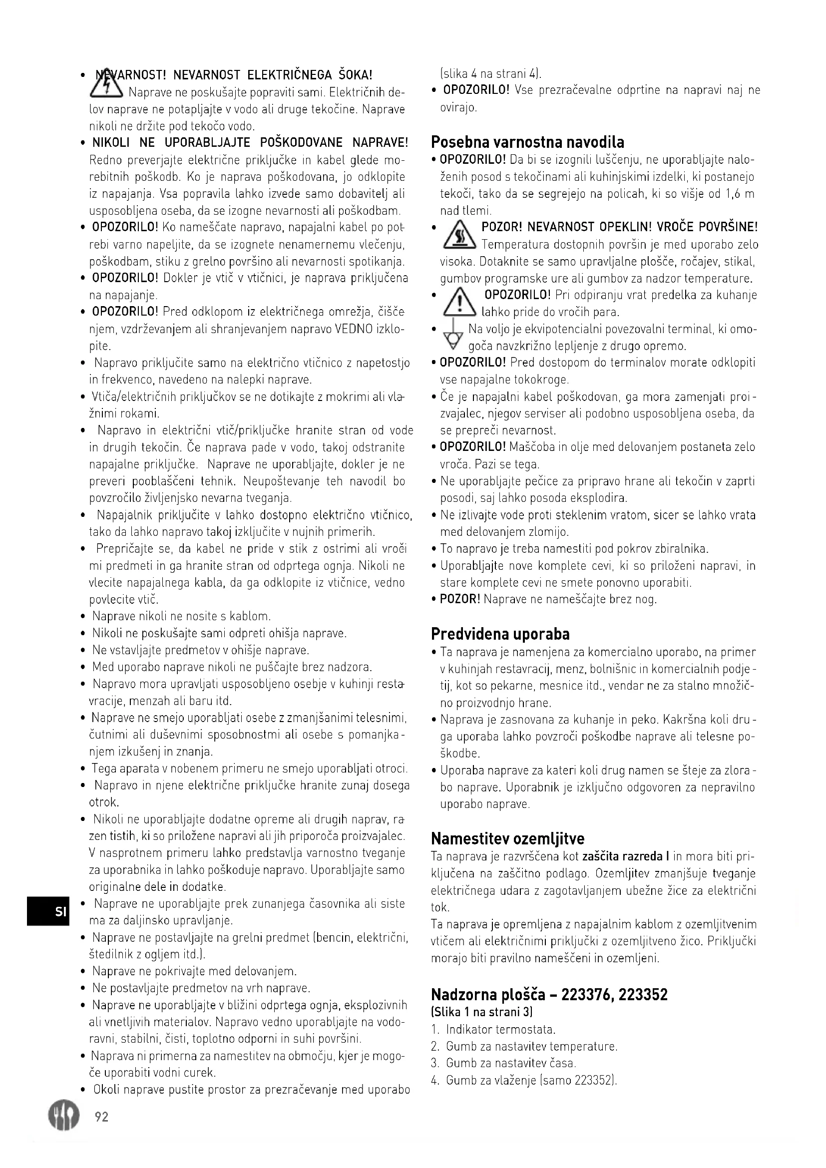 POZOR! NEVARNOST OPEKLIN! VROČE POVRŠINE! Temperatura dostopnih površin je med uporabo zelo visoka. Dotaknite se samo upravljalne plošče, ročajev, stikal, gumbov programske ure ali gumbov za nadzor temperature.