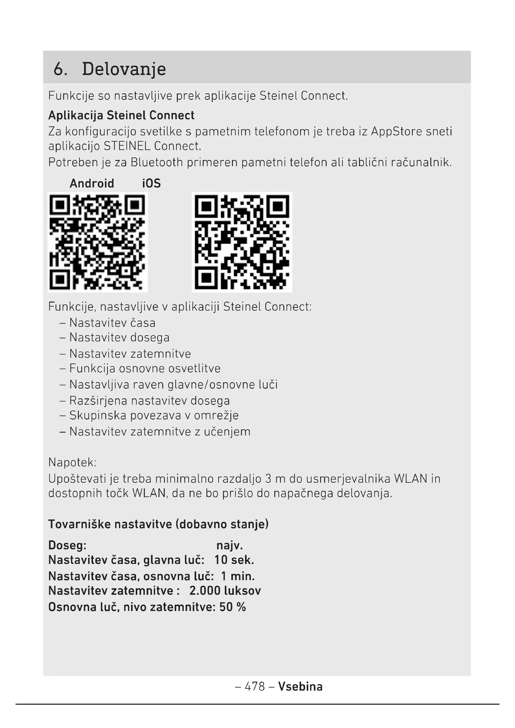 Android iOS unkcije, nastavljive v aplikaciji Steinel Connect: – Nastavitev časa – Nastavitev dosega – Nastavitev zatemnitve – Funkcija osnovne osvetlitve – Nastavljiva raven glavne/osnovne luči – Razširjena nastavitev dosega – Skupinska povezava v omrežje – Nastavitev zatemnitve z učenjem Napotek: Upoštevati je treba minimalno razdaljo 3m do usmerjevalnika WLAN in dostopnih točk WLAN, da ne bo prišlo do napačnega delovanja. Tovarniške nastavitve (dobavno stanje) Doseg: najv. Nastavitev časa, glavna luč: 10 sek. Nastavitev časa, osnovna luč: 1 min. Nastavitev zatemnitve : 2.000luksov Osnovna luč, nivo zatemnitve: 50%– 479 – Vsebina