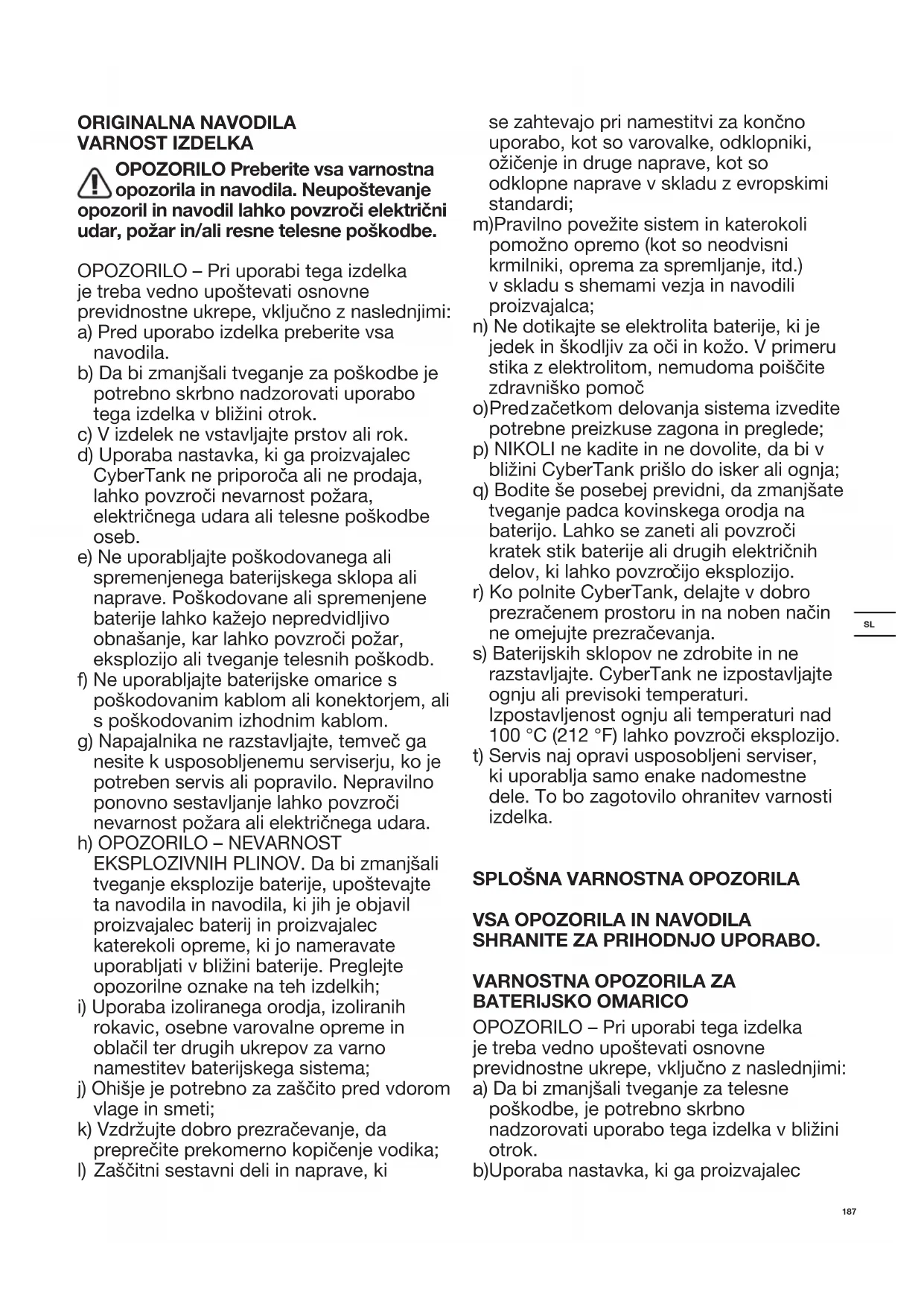 BATERIJSKO OMARICO OPOZORILO – Pri uporabi tega izdelka je treba vedno upoštevati osnovne previdnostne ukrepe, vkljuþno z naslednjimi: a) Da bi zmanjšali tveganje za telesne poškodbe, je potrebno skrbno nadzorovati uporabo tega izdelka v bližini otrok. b)Uporaba nastavka, ki ga proizvajalec188