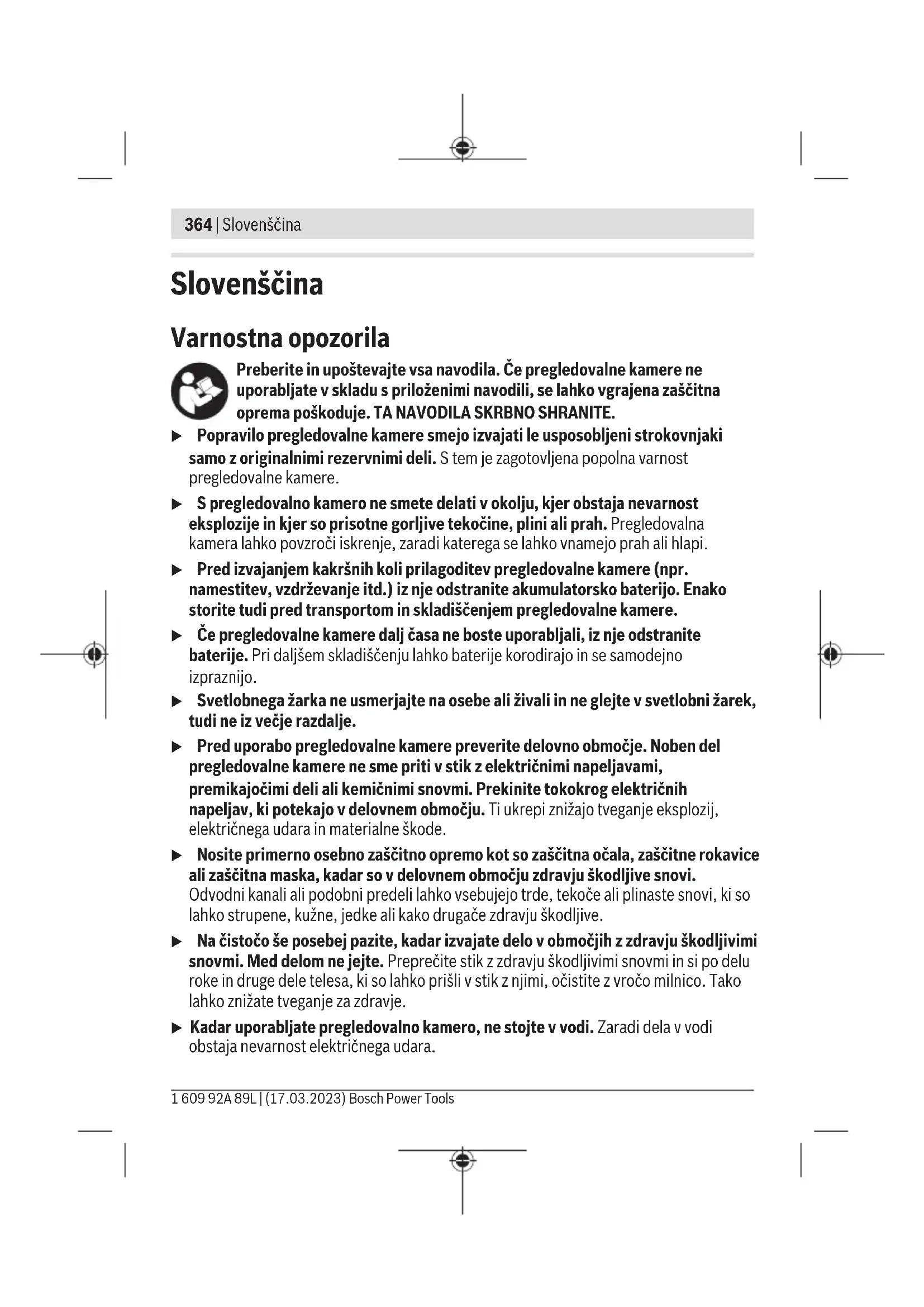 (crveno upozorenje) Micro-SD kartica je puna Obrišite datoteke sa Micro-SD kartice(20). Greška Micro-SD kartice Izvadite Micro-SD karticu(20) i ponovo je umetnite. Proverite Micro-SD karticu u drugom uređaju. Bosch Power Tools 1 609 92A 89L | (17.03.2023)362 | Srpski Održavanje i servis Održavanje i čišćenje Ne uranjajte ručni uređaj(13) u vodu ili druge tečnosti. Uvek održavajte kameru za inspekciju čistom. Očistite kameru za inspekciju i sva pomoćna sredstva posebno temeljno, nakon rada u područjima sa supstancama koje ugrožavaju zdravlje. Brišite zaprljanja sa vlažnom, mekom krpom. Nemojte koristiti sredstva za čišćenje ili rastvarače. Posebno redovno čistite sočiva kamere(4) i pri tome vodite računa o vlaknima. Zamena integrisane dugmaste baterije Dugmastu bateriju mora da zameni Bosch ili ovlašćeni servisni centar za Bosch električne alate. u Pažnja: Dugmastu bateriju uvek menjajte dugmastom baterijom istog tipa. Postoji opasnost od eksplozije. u Ispražnjene dugmaste baterije uklonite prema propisima. Ispražnjene dugmaste baterije mogu da procure i tako oštete proizvod ili povrede osobe. Servis i saveti za upotrebu Servis odgovara na vaša pitanja u vezi sa popravkom i održavanjem vašeg proizvoda kao i u vezi sa rezervnim delovima. Šematske prikaze i informacije u vezi rezervnih delova naći ćete i pod: www.bosch-pt.com Bosch tim za konsultacije vam rado pomaže tokom primene, ukoliko imate pitanja o našim proizvodima i njihovom priboru. Molimo da kod svih pitanja i naručivanja rezervnih delova neizostavno navedete broj artikla sa 10brojčanih mesta prema tipskoj pločici proizvoda. Srpski Bosch Elektroservis Dimitrija Tucovića 59 11000 Beograd Tel.: +381 11 644 8546 Tel.: +381 11 744 3122 Tel.: +381 11 641 6291 Fax: +381 11 641 6293 E-Mail: office@servis-bosch.rs www.bosch-pt.rs 1 609 92A 89L | (17.03.2023) Bosch Power ToolsSrpski | 363 Dodatne adrese servisa pogledajte na: www.bosch-pt.com/serviceaddresses Transport Preporučeni litijum-jonski akumulatori podležu zahtevima propisa o opasnim materijama. Korisnik može bez dodatnih uslova transportovati akumulatore na drumu. Kod slanja preko trećih lica (na primer vazdušnih transportom ili špedicijom) mora se obratiti pažnja na posebne zahteve u pogledu pakovanja i označavanja. Tada se kod pripreme paketa za slanje mora pozvati stručnjak za opasne materije. Akumulatorske baterije šaljite samo ako kućište nije oštećeno. Odlepite otvorene kontakte i upakujte akumulatorsku bateriju tako, da se ne pokreće u paketu. Molimo da obratite pažnju na eventualne dalje nationalne propise. Uklanjanje đubreta Kameru za inspekciju, baterije/akumulatore, pribor i pakovanja treba predati na reciklažu koja je u skladu sa zaštitom životne sredine. Kameru za inspekciju i akumulatore/baterije nemojte da bacate u kućno smeće! Samo za EU‑zemlje: Prema evropskoj smernici 2012/19/EU više neupotrebljive kamere za inspekciju, a prema evropskoj smernici 2006/66/EC i akumulatori/baterije koji su u kvaru ili istrošeni moraju da se odvojeno sakupljaju i odvoze na reciklažu koja odgovara zaštiti životne sredine. Ukoliko se elektronski i električni uređaji otklone u otpad na neispravan način, moguće opasne materije mogu da imaju štetno dejstvo na životnu sredinu i zdravlje ljudi. Akumulatorske baterije/baterije: Li-jonska: Molimo da obratite pažnju na napomene u odeljku Transport (videti „Transport“, Strana363). Integrisane dugmaste baterije sme da uklanja samo stručno osoblje radi odlaganja na otpad. Bosch Power Tools 1 609 92A 89L | (17.03.2023)364 | Slovenščina Slovenščina Varnostna opozorila Preberite in upoštevajte vsa navodila. Če pregledovalne kamere ne uporabljate v skladu s priloženimi navodili, se lahko vgrajena zaščitna oprema poškoduje. TA NAVODILA SKRBNO SHRANITE. u Popravilo pregledovalne kamere smejo izvajati le usposobljeni strokovnjaki samo z originalnimi rezervnimi deli. S tem je zagotovljena popolna varnost pregledovalne kamere. u S pregledovalno kamero ne smete delati v okolju, kjer obstaja nevarnost eksplozije in kjer so prisotne gorljive tekočine, plini ali prah. Pregledovalna kamera lahko povzroči iskrenje, zaradi katerega se lahko vnamejo prah ali hlapi. u Pred izvajanjem kakršnih koli prilagoditev pregledovalne kamere (npr. namestitev, vzdrževanje itd.) iz nje odstranite akumulatorsko baterijo. Enako storite tudi pred transportom in skladiščenjem pregledovalne kamere. u Če pregledovalne kamere dalj časa ne boste uporabljali, iz nje odstranite baterije. Pri daljšem skladiščenju lahko baterije korodirajo in se samodejno izpraznijo. u Svetlobnega žarka ne usmerjajte na osebe ali živali in ne glejte v svetlobni žarek, tudi ne iz večje razdalje. u Pred uporabo pregledovalne kamere preverite delovno območje. Noben del pregledovalne kamere ne sme priti v stik z električnimi napeljavami, premikajočimi deli ali kemičnimi snovmi. Prekinite tokokrog električnih napeljav, ki potekajo v delovnem območju. Ti ukrepi znižajo tveganje eksplozij, električnega udara in materialne škode. u Nosite primerno osebno zaščitno opremo kot so zaščitna očala, zaščitne rokavice ali zaščitna maska, kadar so v delovnem območju zdravju škodljive snovi. Odvodni kanali ali podobni predeli lahko vsebujejo trde, tekoče ali plinaste snovi, ki so lahko strupene, kužne, jedke ali kako drugače zdravju škodljive. u Na čistočo še posebej pazite, kadar izvajate delo v območjih z zdravju škodljivimi snovmi. Med delom ne jejte. Preprečite stik z zdravju škodljivimi snovmi in si po delu roke in druge dele telesa, ki so lahko prišli v stik z njimi, očistite z vročo milnico. Tako lahko znižate tveganje za zdravje. u Kadar uporabljate pregledovalno kamero, ne stojte v vodi. Zaradi dela v vodi obstaja nevarnost električnega udara. 1 609 92A 89L | (17.03.2023) Bosch Power ToolsSlovenščina | 365 u Akumulatorske baterije ne odpirajte. Nevarnost kratkega s