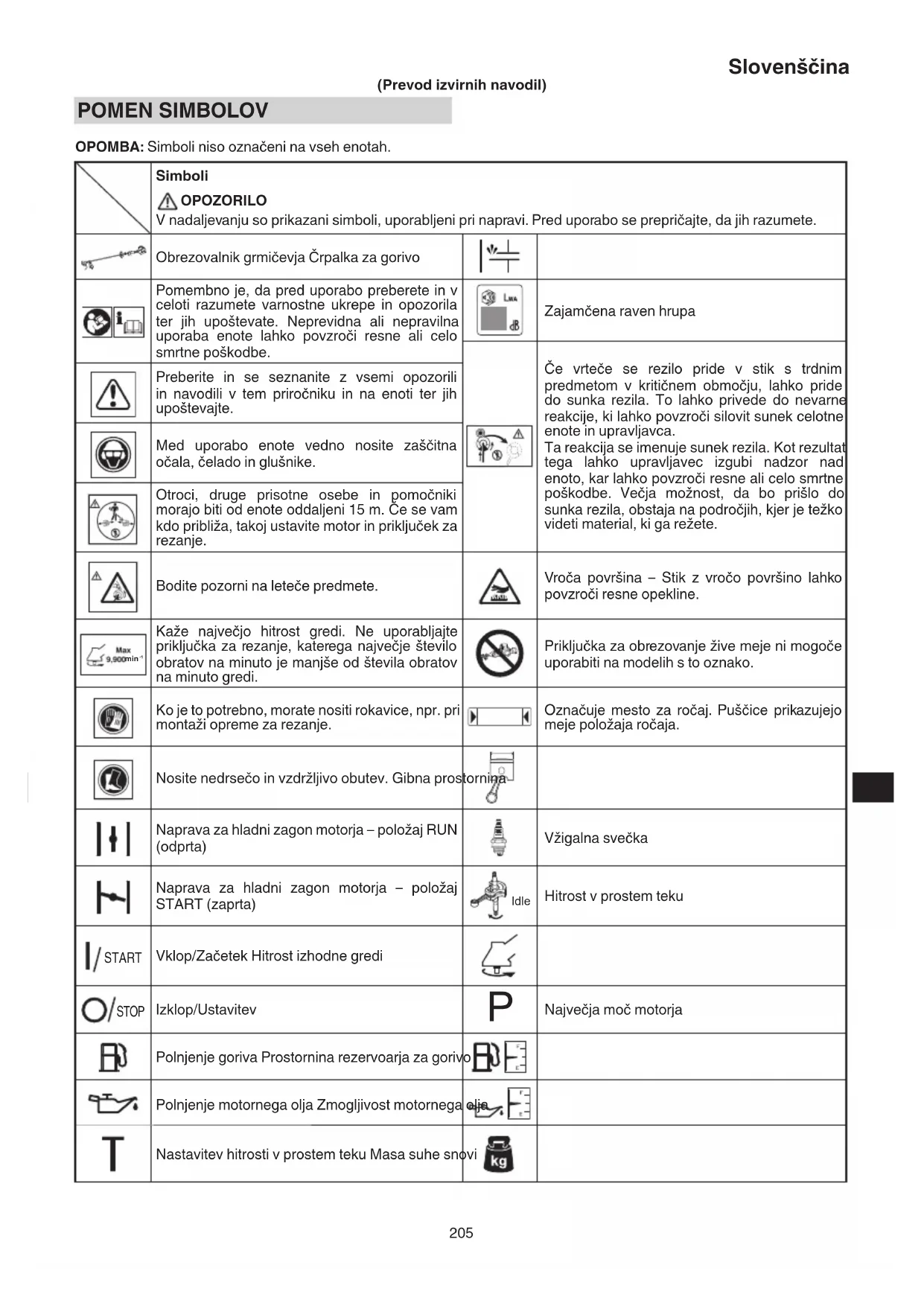 (Prevod izvirnih navodil) POMEN SIMBOLOV OPOMBA: Simboli niso označeni na vseh enotah. Simboli OPOZORILO V nadaljevanju so prikazani simboli, uporabljeni pri napravi. Pred uporabo se prepričajte, da jih razumete. Obrezovalnik grmičevja Črpalka za gorivo Pomembno je, da pred uporabo preberete in v celoti razumete varnostne ukrepe in opozorila ter jih upoštevate. Neprevidna ali nepravilna uporaba enote lahko povzroči resne ali celo smrtne poškodbe. Zajamčena raven hrupa Če vrteče se rezilo pride v stik s trdnim predmetom v kritičnem območju, lahko pride do sunka rezila. To lahko privede do nevarne reakcije, ki lahko povzroči silovit sunek celotne enote in upravljavca. Ta reakcija se imenuje sunek rezila. Kot rezultat tega lahko upravljavec izgubi nadzor nad enoto, kar lahko povzroči resne ali celo smrtne poškodbe. Večja možnost, da bo prišlo do sunka rezila, obstaja na področjih, kjer je težko videti material, ki ga režete. Preberite in se seznanite z vsemi opozorili in navodili v tem priročniku in na enoti ter jih upoštevajte. Med uporabo enote vedno nosite zaščitna očala, čelado in glušnike. Otroci, druge prisotne osebe in pomočniki morajo biti od enote oddaljeni 15 m. Če se vam kdo približa, takoj ustavite motor in priključek za rezanje. Bodite pozorni na leteče predmete. Vroča površina – Stik z vročo površino lahko povzroči resne opekline. min