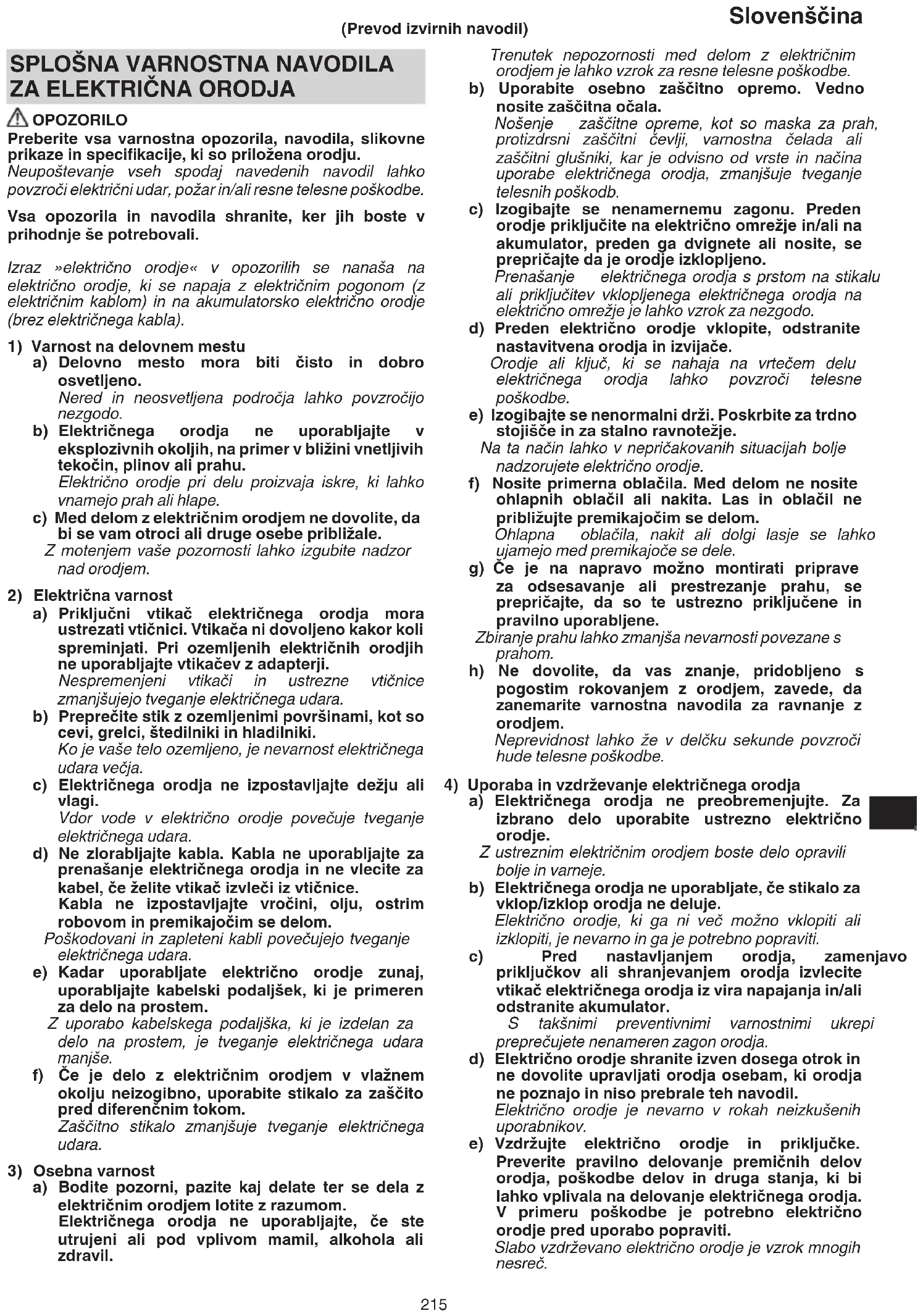 a) Bodite pozorni, pazite kaj delate ter se dela z električnim orodjem lotite z razumom. Električnega orodja ne uporabljajte, če ste utrujeni ali pod vplivom mamil, alkohola ali zdravil. (Prevod izvirnih navodil) 00BookG3612DVEEU.indb21500BookG3612DVEEU.indb215 2022/08/3016:26:322022/08/3016:26:32216 Slovenščina f) Rezalno orodje naj bo ostro in čisto. Pravilno vzdrževano rezalno orodje z ostrimi robovi se manj pogosto zatika in je lažje vodljivo. g) Električno orodje, pribor, vsadna orodja in podobno uporabljajte v skladu s temi navodili, pri čemer upoštevajte delovne pogoje in dejavnost, ki jo boste opravljali. Uporabo električnega orodja v druge namene lahko privede do nevarne situacije. h) Ročaji in prijemalne površine naj bodo suhe, čiste in brez olja in masti. Spolzki ročaji in prijemalne površine ne omogočajo varnega ravnanja in nadzora orodja v nepričakovanih situacijah.