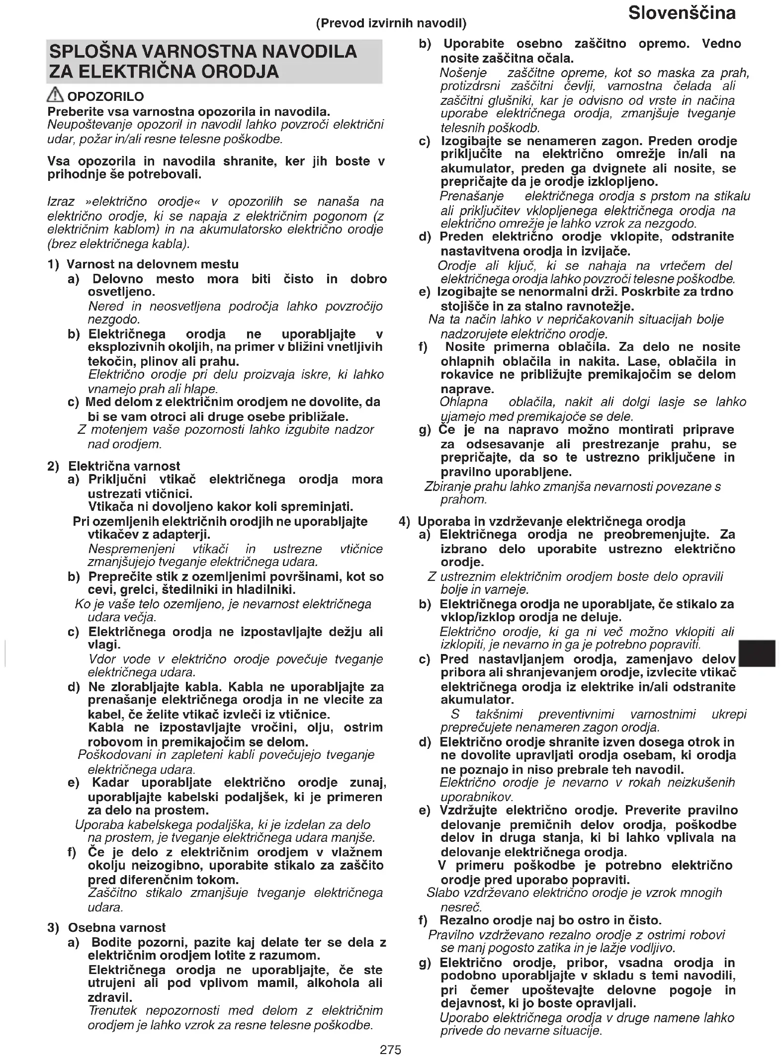 a) Bodite pozorni, pazite kaj delate ter se dela z električnim orodjem lotite z razumom. Električnega orodja ne uporabljajte, če ste utrujeni ali pod vplivom mamil, alkohola ali zdravil. Trenutek nepozornosti med delom z električnim orodjem je lahko vzrok za resne telesne poškodbe. (Prevod izvirnih navodil) 00BookNR1890DBCL.indb27500BookNR1890DBCL.indb275 2020/08/0711:39:442020/08/0711:39:44276 Slovenščina