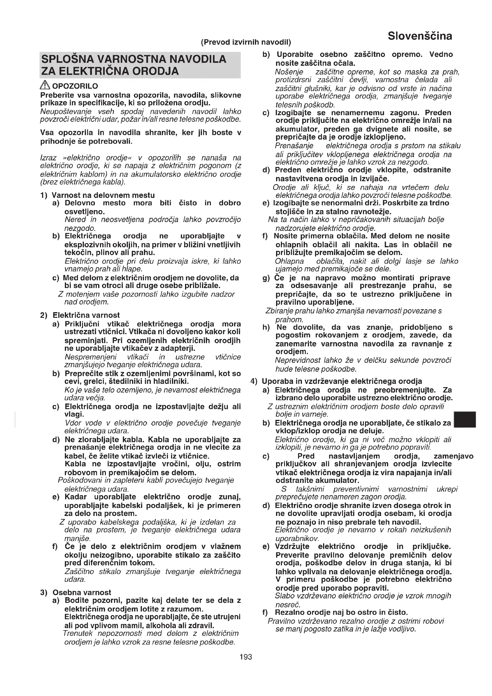 OPOZORILO Preberite vsa varnostna opozorila, navodila, slikovne prikaze in specifi kacije, ki so priložena orodju. Neupoštevanje vseh spodaj navedenih navodil lahko povzroči električni udar, požar in/ali resne telesne poškodbe. Vsa opozorila in navodila shranite, ker jih boste v prihodnje še potrebovali. Izraz »električno orodje« v opozorilih se nanaša na električno orodje, ki se napaja z električnim pogonom (z električnim kablom) in na akumulatorsko električno orodje (brez električnega kabla).