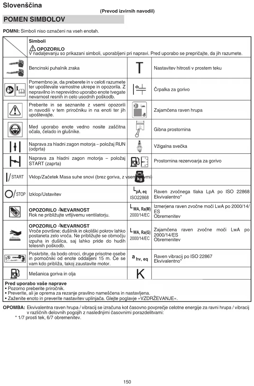 (Prevod izvirnih navodil) POMEN SIMBOLOV POMNI: Simboli niso označeni na vseh enotah. Simboli OPOZORILO V nadaljevanju so prikazani simboli, uporabljeni pri napravi. Pred uporabo se prepričajte, da jih razumete. Bencinski puhalnik zraka Nastavitev hitrosti v prostem teku Pomembno je, da preberete in v celoti razumete ter upoštevate varnostne ukrepe in opozorila. Z nepravilno in neprevidno uporabo enote tvegate nevarnost resnih in celo usodnih poškodb. Črpalka za gorivo Preberite in se seznanite z vsemi opozorili in navodili v tem priročniku in na enoti ter jih upoštevajte. Zajamčena raven hrupa Med uporabo enote vedno nosite zaščitna očala, čelado in glušnike. Gibna prostornina Naprava za hladni zagon motorja – položaj RUN (odprta) Vžigalna svečka Naprava za hladni zagon motorja – položaj START (zaprta) Prostornina rezervoarja za gorivo START Vklop/Začetek Masa suhe snovi (brez goriva, z vsemi cevmi) STOP Izklop/Ustavitev