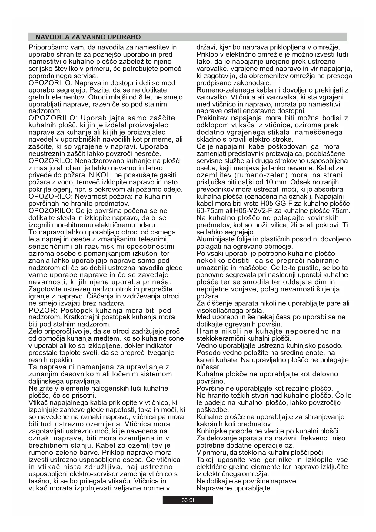 ZA UPORABNIKA Dovoljena je samo namenska uporaba kuhalne plošče, tj. za kuhanje v gospodinjstvih. Drugačna uporaba ni dovoljena in predstavlja tveganje za uporabnika. Proizvajalec ne prevzema odgovornosti za poškodbe ali škodo zaradi nenamenske uporabe.