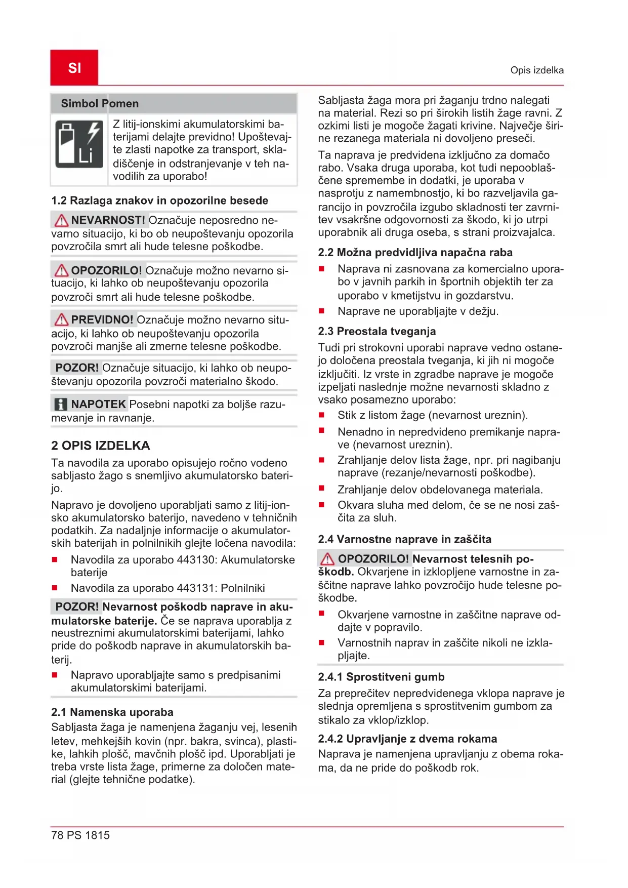 NEVARNOST! Označuje neposredno ne- varno situacijo, ki bo ob neupoštevanju opozorila povzročila smrt ali hude telesne poškodbe. OPOZORILO! Označuje možno nevarno si- tuacijo, ki lahko ob neupoštevanju opozorila povzroči smrt ali hude telesne poškodbe. PREVIDNO! Označuje možno nevarno situ- acijo, ki lahko ob neupoštevanju opozorila povzroči manjše ali zmerne telesne poškodbe. POZOR! Označuje situacijo, ki lahko ob neupo- števanju opozorila povzroči materialno škodo. NAPOTEK Posebni napotki za boljše razu- mevanje in ravnanje. 2 OPIS IZDELKA Ta navodila za uporabo opisujejo ročno vodeno sabljasto žago s snemljivo akumulatorsko bateri- jo. Napravo je dovoljeno uporabljati samo z litij-ion- sko akumulatorsko baterijo, navedeno v tehničnih podatkih. Za nadaljnje informacije o akumulator- skih baterijah in polnilnikih glejte ločena navodila: