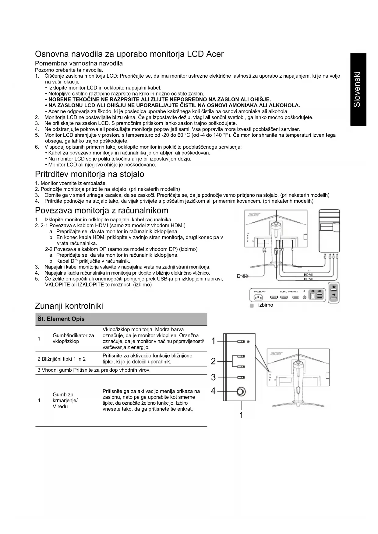 4Slovenski Predpisi in varnostna obvestila Obvestilo organizacije FCC Naprava je bila preizkušena in izpolnjuje pogoje, določene za digitalne naprave razreda B v skladu s 15. členom pravilnika FCC. Mejne vrednosti so postavljene, da bi uporabnike zaščitile pred škodljivimi motnjami v stanovanjskih napeljavah. Naprava ustvarja, uporablja in lahko oddaja radiofrekvenčno energijo. Če jo namestite in uporabljate v nasprotju s temi navodili, lahko povzroča škodljive motnje v radijski komunikaciji. Kljub temu ne zagotavljamo, da pod določenimi pogoji do teh frekvenc ne bi prišlo. Če naprava povzroča škodljive motnje v radijskem ali televizijskem sprejemu, kar lahko ugotovite tako, da jo vklopite in izklopite, uporabnikom svetujemo, naj motnje poskušajo odpraviti na naslednje načine: Preusmerite ali prestavite sprejemno anteno. Povečajte razdaljo med napravo in sprejemnikom. Priklopite napravo na vtičnico v drugem krogotoku kot sprejemnik. Za pomoč se obrnite na zastopnika ali izkušenega radijskega/televizijskega serviserja. Izjava o skladnosti CE S tem družba Acer Inc. izjavlja, da je ta monitor LCD v skladu z bistvenimi zahtevami in drugimi ustreznimi določili direktive o elektromagnetni združljivosti 2014/30/EU, direktive o nizki napetosti 2014/35/EU, direktive RoHS 2011/65/EU in direktive 2009/125/ES glede vzpostavljanja okvira za določanje zahtev okolju prijazne zasnove energetskih izdelkov. Obvestilo: Da ne bi poškodovali monitorja, ga ne dvigujte tako, da ga držite za podnožje. Obvestilo: Oklopljeni kabli Za zagotavljanje skladnosti s predpisi o elektromagnetni združljivosti, morajo biti vse povezave z drugimi računalniškimi napravami vzpostavljene z oklopljenimi kabli. Obvestilo: Zunanje naprave Na opremo lahko priklopite le zunanje naprave (vhodne/izhodne naprave, terminale, tiskalnike in tako naprej), ki ustrezajo omejitvam razreda B. Uporaba zunanje opreme, ki tem pogojem ne ustreza, lahko povzroči motnje radijskega in televizijskega sprejema. Pozor Spremembe, ki jih ni izrecno odobril proizvajalec, lahko uporabniku odvzamejo pooblastilo za uporabo izdelka, ki jo dodeljuje Federal Communications Commission. Pogoji delovanja Ta naprava je skladna z določili 15. člena pravilnika FCC. Uporaba je dovoljena pod naslednjima pogojema: (1) naprava ne sme povzročati škodljivih motenj in (2) naprava mora sprejeti vse motnje, vključno z motnjami, ki bi lahko povzročile neželeno delovanje. Obvestilo: Kanadski uporabniki Ta digitalna naprava razreda B je v skladu s kanadskim predpisom ICES-003. Remarque à l'intention des utilisateurs canadiens Cet appareil numérique de la classe B est conforme à la norme NMB-003 du Canada. Odlaganje odpadne opreme uporabnikov v zasebnih gospodinjstvih v Evropski uniji Ta simbol na izdelku ali njegovi embalaži navaja, da izdelka ne smete zavreči z drugimi gospodinjskimi odpadki. Namesto tega je vaša odgovornost, da odpadno opremo zavržete tako, da jo predate na določenih zbirnih mestih za recikliranje odpadne električne in elektronske opreme. Z ločenim zbiranjem in recikliranjem odpadne opreme ob odlaganju boste pomagali pri ohranjanju naravnih virov in zagotavljanju, da bo reciklirana tako, da bosta zaščitena zdravje ljudi in okolje. Za več informacij o tem, kje lahko odložite odpadno opremo za recikliranje, pokličite občinski urad, podjetje za odvažanje gospodinjskih odpadkov ali trgovino, kjer ste kupili izdelek.Slovenski SPECIFIKACIJE Priročnike in druge dokumente o vašem Acerjevem izdelku si lahko ogledate na uradni Acerjevi strani za podporo. *Letna poraba energije se izračuna s pomočjo običajne porabe energije pri uporabi 4 ure na dan in 365 dni na leto. Zaslon LCD Upravljalni sistem Barvni TFT LCD Velikost 24,5”W (62 cm) Razdalja med pikami 0,283 mm (V) x 0,280 mm (N) Svetlost Izvirna: 400 cd/m