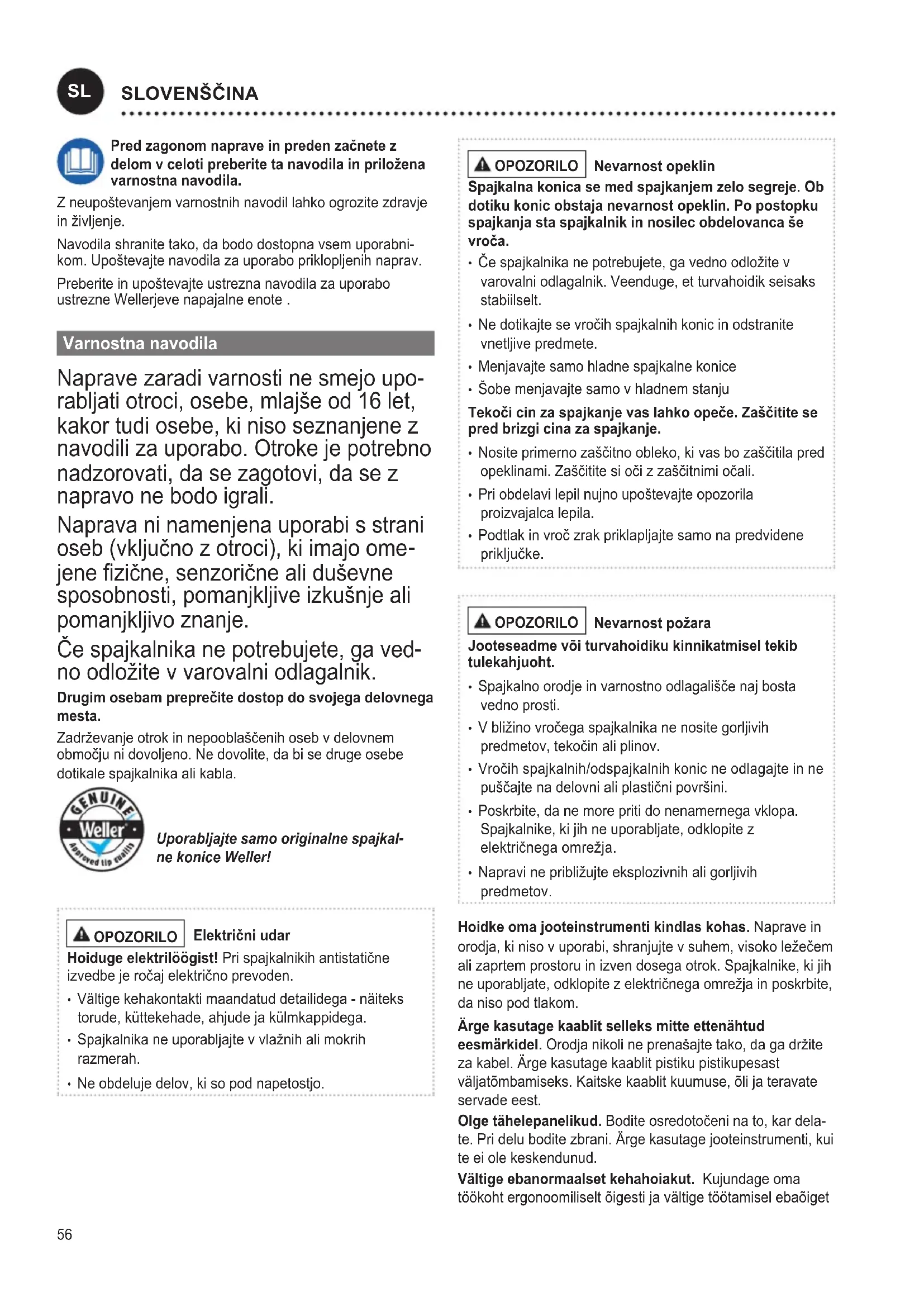 no odložite v varovalni odlagalnik. Drugim osebam preprečite dostop do svojega delovnega mesta. Zadrževanje otrok in nepooblaščenih oseb v delovnem območju ni dovoljeno. Ne dovolite, da bi se druge osebe dotikale spajkalnika ali kabla. Uporabljajte samo originalne spajkal- ne konice Weller! OPOZORILO Električni udar Hoiduge elektrilöögist! Pri spajkalnikih antistatične izvedbe je ročaj električno prevoden.