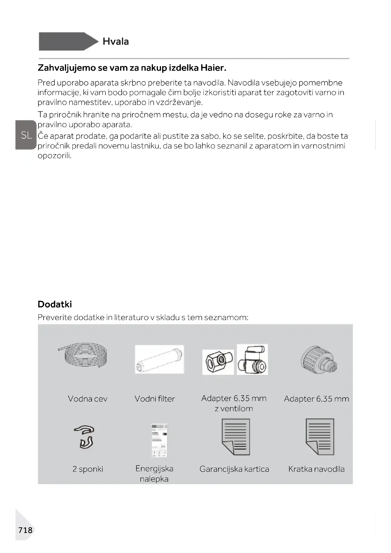 Zahvaljujemo se vam za nakup izdelka Haier. Pred uporabo aparata skrbno preberite ta navodila. Navodila vsebujejo pomembne informacije, ki vam bodo pomagale čim bolje izkoristiti aparat ter zagotoviti varno in pravilno namestitev, uporabo in vzdrževanje. Ta priročnik hranite na priročnem mestu, da je vedno na dosegu roke za varno in pravilno uporabo aparata. Če aparat prodate, ga podarite ali pustite za sabo, ko se selite, poskrbite, da boste ta priročnik predali novemu lastniku, da se bo lahko seznanil z aparatom in varnostnimi opozorili. Dodatki Preverite dodatke in literaturo v skladu s tem seznamom: