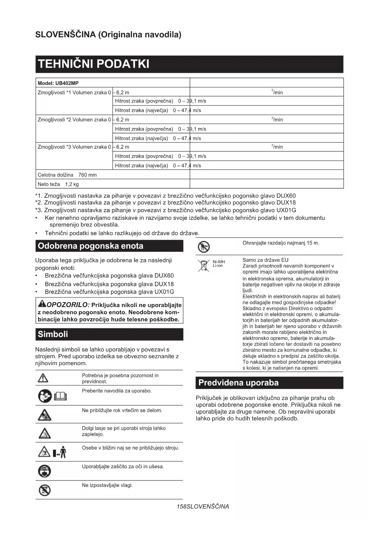 - BrezžičnavečfunkcijskapogonskaglavaUX01G OPOZORILO: Priključka nikoli ne uporabljajte z neodobreno pogonsko enoto. Neodobrene kom- binacije lahko povzročijo hude telesne poškodbe. Simboli Naslednji simboli se lahko uporabljajo v povezavi s strojem. Pred uporabo izdelka se obvezno seznanite z njihovim pomenom. Potrebna je posebna pozornost in previdnost. Preberite navodila za uporabo. Nepribližujterokvrtečimsedelom. Dolgi lasje se pri uporabi stroja lahko zapletejo. Osebevbližininajsenepribližujejostroju. Uporabljajtezaščitozaočiinušesa. Ne izpostavljajte vlagi. Ohranjajte razdaljo najmanj 15 m. Ni-MH Li-ion SamozadržaveEU Zaradi prisotnosti nevarnih komponent v opremiimajolahkouporabljenaelektrična in elektronska oprema, akumulatorji in baterije negativen vpliv na okolje in zdravje ljudi. Električnihinelektronskihnapravalibaterij ne odlagajte med gospodinjske odpadke! Skladno z evropsko Direktivo o odpadni električniinelektronskiopremi,oakumula- torjih in baterijah ter odpadnih akumulator- jihinbaterijahternjenouporabovdržavnih zakonihmoraterabljenoelektričnoin elektronsko opremo, baterije in akumula- torjezbiratiločenoterdostavitinaposebno zbiralno mesto za komunalne odpadke, ki delujeskladnospredpisizazaščitookolja. Tonakazujesimbolprečrtanegasmetnjaka s kolesi, ki je natisnjen na opremi. Predvidena uporaba Priključekjeoblikovanizključnozapihanjeprahuob uporabiodobrenepogonskeenote.Priključkanikoline uporabljajte za druge namene. Ob nepravilni uporabi lahkopridedohudihtelesnihpoškodb.159 SLOVENŠČINA Izjava o skladnosti ES Samo za evropske države Mi kot proizvajalec: Makita Europe N.V.,sedežpod- jetja: Jan-Baptist Vinkstraat 2 3070 Kortenberg BELGIUM.pooblaščamoHiroshi Tsujimura za pri- pravotehničnedokumentacijeinzizključnoodgovor- nostjo izjavljamo, da izdelki: Z oznako: Nastavek za pihanje. Oznaka tipa: UB402MP. izpolnjujejovseustreznedoločbeDirektive2006/42/ ESintudivseustreznedoločbenaslednjihdirektivES/ EU:2000/14/ES in so izdelani v skladu z naslednjimi harmoniziranimi standardi: EN 60335-1:2012+A11:201 4+A13:2017+A1:2019+A14:2019+A2:2019, EN 50636- 2-100:2014. Kraj in datum izjave: Kortenberg, Belgija. 31.10.2022 Odgovorna oseba: Hiroshi Tsujimura, Direktor – Makita Europe N.V. VARNOSTNA OPOZORILA Varnostna navodila za puhalnik OPOZORILO: Pred uporabo preberite vsa varnostna opozorila, navodila, slike in tehnične podatke, ki so priloženi tej napravi, ter navodila za uporabo pogonske enote.Zaradineupoštevanja vsehspodnjihnavodillahkopridedoelektričnega udara,požarain/alihudetelesnepoškodbeuprav- ljavca in/ali oseb v okolici. Shranite vsa opozorila in navo- dila za poznejšo uporabo. Izraza„priključekzakrtačenje/priključekzapometanje“ in „naprava“ v opozorilih in previdnostnih ukrepih se nanašatanakombinacijopriključkainpogonskeenote. Usposabljanje