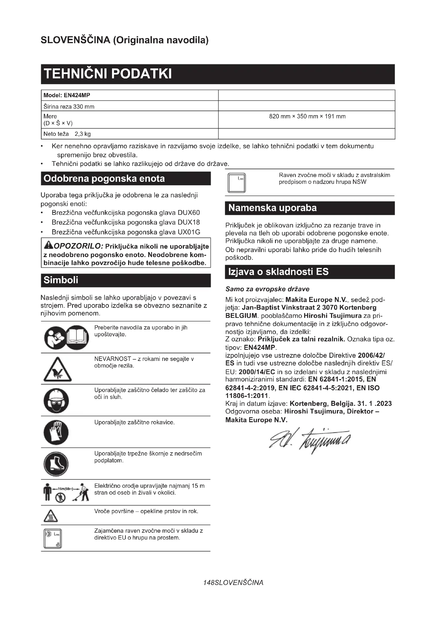 - BrezžičnavečfunkcijskapogonskaglavaUX01G OPOZORILO: Priključka nikoli ne uporabljajte z neodobreno pogonsko enoto. Neodobrene kom- binacije lahko povzročijo hude telesne poškodbe. Simboli Naslednjisimboliselahkouporabljajovpovezavis strojem.Preduporaboizdelkaseobveznoseznanitez njihovimpomenom. Preberitenavodilazauporaboinjih upoštevajte. NEVARNOST–zrokaminesegajtev območjerezila. Uporabljajtezaščitnočeladoterzaščitoza očiinsluh. Uporabljajtezaščitnerokavice. Uporabljajtetrpežneškornjeznedrsečim podplatom. Električnoorodjeupravljajtenajmanj15m stranodosebinživalivokolici. Vročepovršine–opeklineprstovinrok. Zajamčenaravenzvočnemočivskladuz direktivo EU o hrupu na prostem. Ravenzvočnemočivskladuzavstralskim predpisom o nadzoru hrupa NSW Namenska uporaba Priključekjeoblikovanizključnozarezanjetravein plevelanatlehobuporabiodobrenepogonskeenote. Priključkanikolineuporabljajtezadrugenamene. Obnepravilniuporabilahkopridedohudihtelesnih poškodb. Izjava o skladnosti ES Samo za evropske države Mikotproizvajalec:Makita Europe N.V.,sedežpod- jetja:Jan-Baptist Vinkstraat 2 3070 Kortenberg BELGIUM.pooblaščamoHiroshi Tsujimura za pri- pravotehničnedokumentacijeinzizključnoodgovor- nostjoizjavljamo,daizdelki: Zoznako:Priključek za talni rezalnik. Oznaka tipa oz. tipov: EN424MP. izpolnjujejovseustreznedoločbeDirektive2006/42/ ESintudivseustreznedoločbenaslednjihdirektivES/ EU: 2000/14/ECinsoizdelanivskladuznaslednjimi harmoniziranimi standardi: EN 62841-1:2015, EN 62841-4-2:2019, EN IEC 62841-4-5:2021, EN ISO 11806-1:2011. Krajindatumizjave:Kortenberg, Belgija. 31. 1 .2023 Odgovornaoseba:Hiroshi Tsujimura, Direktor – Makita Europe N.V.149 SLOVENŠČINA VARNOSTNA OPOZORILA Varnostna opozorila za brezžične škarje za travo